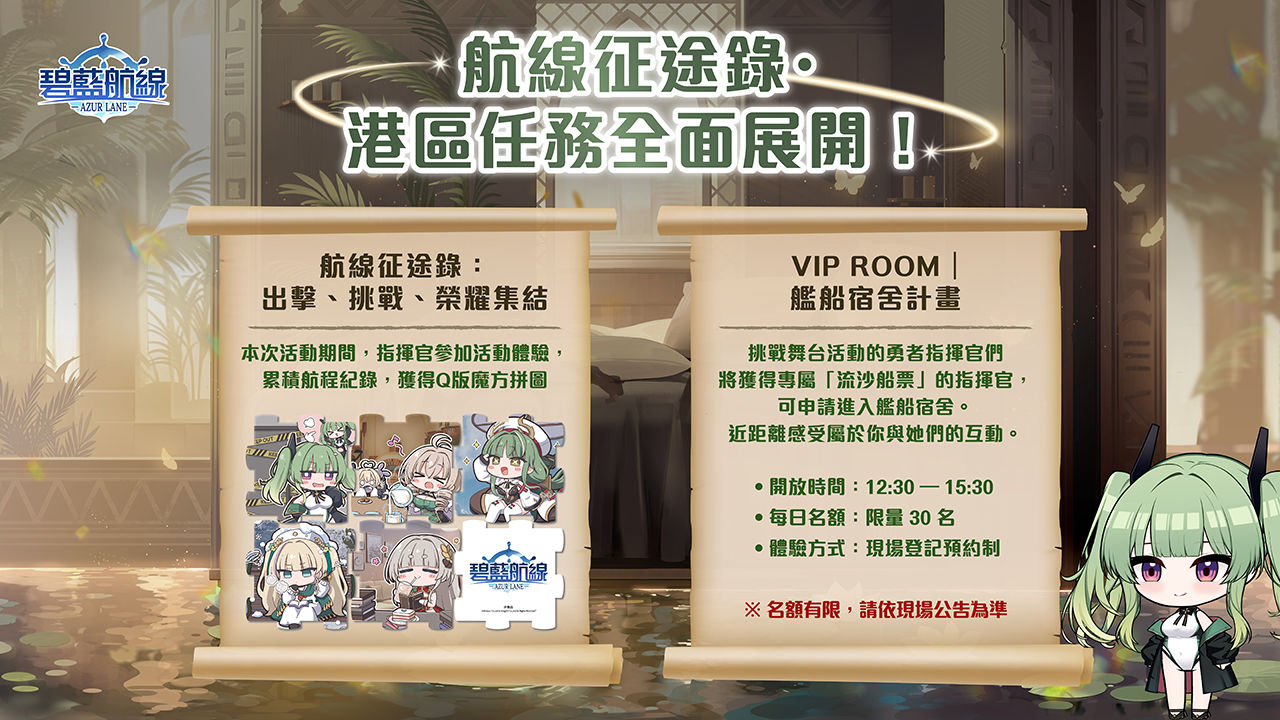 在一般展區體驗方面,官方規劃了一連串的互動闖關活動。玩家至服務台領取集章卡後,可參與「撫順大冒險」觸控遊戲與「艦船出擊」彈珠檯挑戰,藉此收集拼圖碎片。除了遊戲挑戰,現場還設置了拍照打卡與隱藏密語任務,只要集滿指定數量的拼圖,即可兌換變色馬克杯、魔術燈箱等展場限定周邊。表現優異者更有機會直接獲得上述 VIP 體驗區的入場門票。