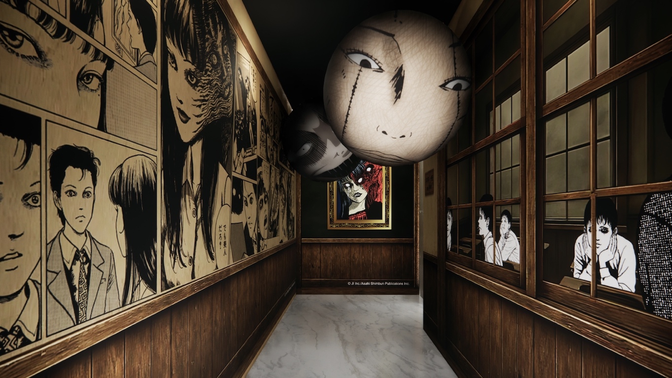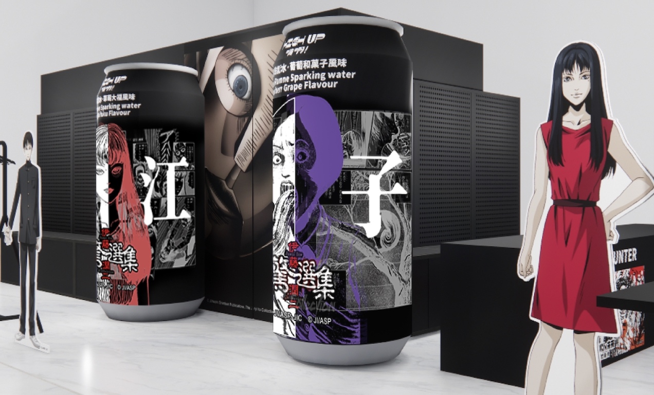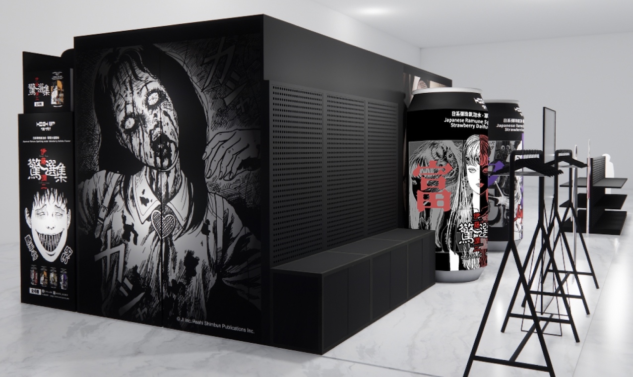 七大打卡點帶你從現實一步踏入漫畫深淵,在遠方就看到有著富江、淵及蛞蝓少女等三大區的「角色合照牆」,二次元與現實邊界瞬間模糊,彷彿進入黑白分明的漫畫格中。入口處「聯名罐裝飲品充氣裝置」黑底剪影搭配大膽跳色,將富江、雙一、夕子與淵的詭譎封印其中。店內重現惡作劇少年怨念纏繞的課後空間「被詛咒的雙一教室」,小心!一坐下可能被口含鐵釘的雙一盯上,抬起頭又看到盤旋空中「巨型人頭氣球」,每秒都令人戰慄啊!接著看到絕美少女「富江」與神祕少年「押切」立牌冰冷視線直視你靈魂,一旁展現細膩卻窒息筆觸的「原畫大型背板」讓人溺於老師筆下的世界,而展場限定拍貼機旁的「淵立牌」,也許在你專注鏡頭瞬間,她早已帶著尖銳細牙悄悄靠近,粉絲們過年走春就來這啊!