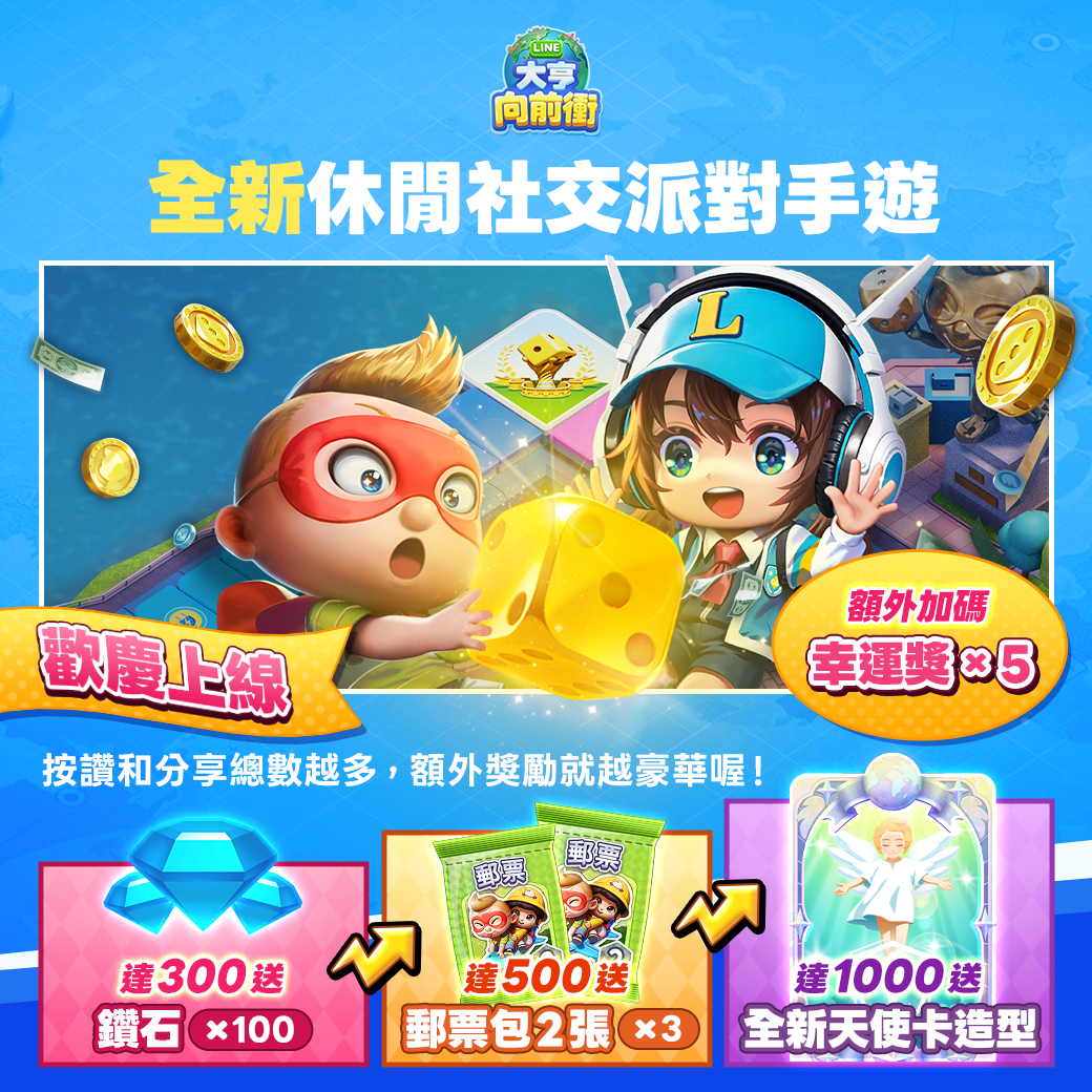 為慶祝遊戲正式上市,針對參與事前登錄活動的玩家將獲得特別的遊戲內獎勵。符合資格的玩家只需登入《LINE大亨向前衝》即可獲得。獎勵內容包含「骰子x 100+郵票包1張x 5+裝潢衝刺時刻30分鐘+金幣x 100,000+綜合召喚幣x 30+鑽石x 300+STAR點數x 100+免廣告特權卡(2日)」各種好禮!更棒的是現在《LINE大亨向前衝》正限時舉辦許多上市活動,玩家可參與迷你遊戲與任務來蒐集更多道具及限定角色。