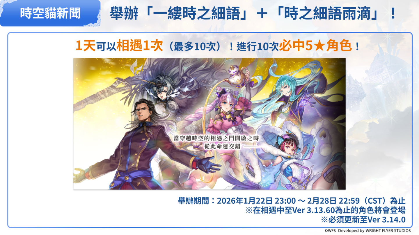 舉辦自2026年1月22日 23:00 ~ 2026年2月28日 22:59(CST)為止的期間,將舉辦每天可以使用1次「一縷時之細語」來進行相遇的活動。(最多10次)而且,每使用「一縷時之細語」進行1次相遇,即可獲得1個「時之細語雨滴」。收集10個「時之細語雨滴」,就能進行「時之細語雨滴之相遇」(限定1次・必出5★職業)。