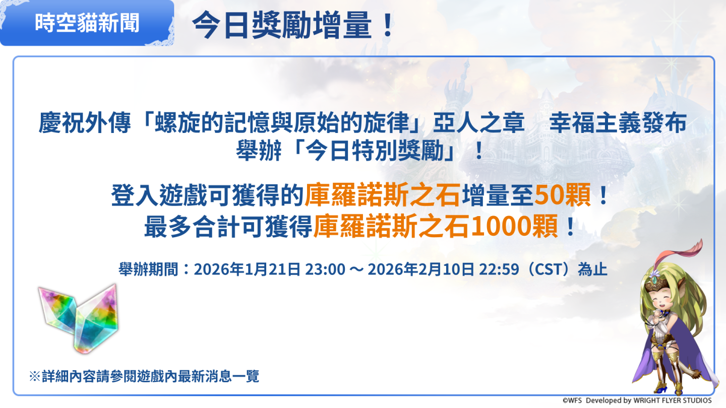 2026年1月21日 23:00 〜 2026年2月10日 22:59(CST)為止的期間,「今日獎勵」的庫羅諾斯之石增量至50顆!最多合計可獲得庫羅諾斯之石1000顆!