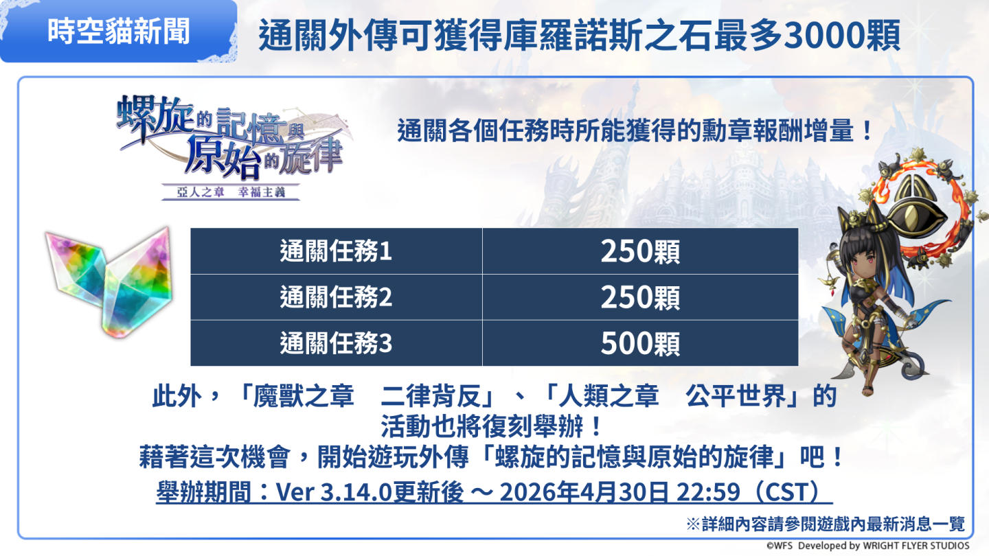 同時復刻舉辦第1章與第2章的勳章報酬增量,最多合計可獲得庫羅諾斯之石3000顆。