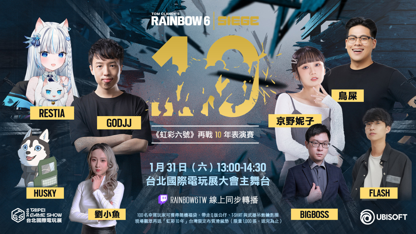 Ubisoft 為慶祝戰術射擊遊戲《虹彩六號:圍攻行動》發行屆滿 10 週年,將於 2026 台北國際電玩展期間舉辦特別活動。官方預定於 1 月 31 日下午 1 點在 TGS 大會主舞台舉行「再戰十年表演賽」,邀請 GodJJ、鳥屎、Restia 瑞斯帝亞等多位知名實況主同台競技。現場除了精彩賽事,更準備了限量 1,000 張的紀念滑鼠墊與百份福袋,回饋長期支持的台灣玩家社群。