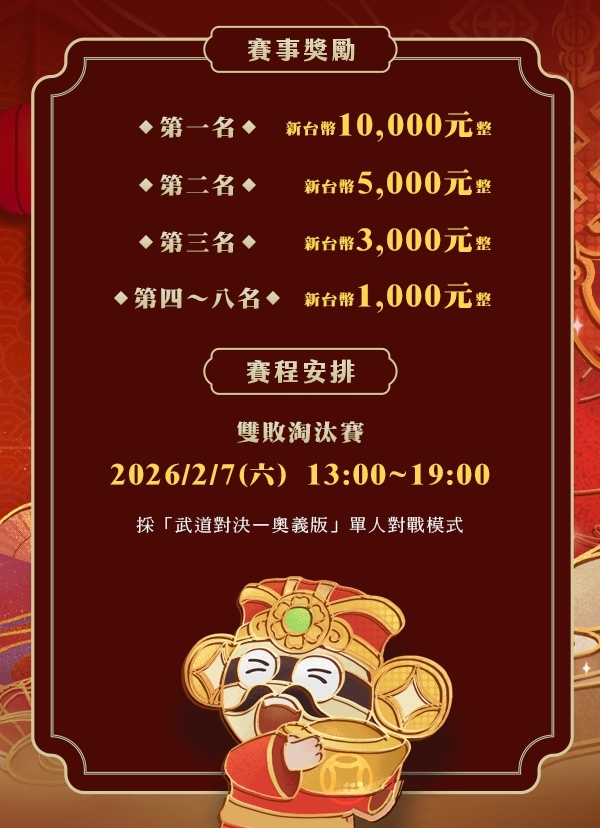 新的一年,第一包紅包不靠運氣、只憑實力!歡迎豪傑們踴躍報名挑戰,在新春之際為自己博個好彩頭。賽事名額與報名時間有限,也提醒有興趣的玩家把握機會、及早報名,以免錯過新春首戰!