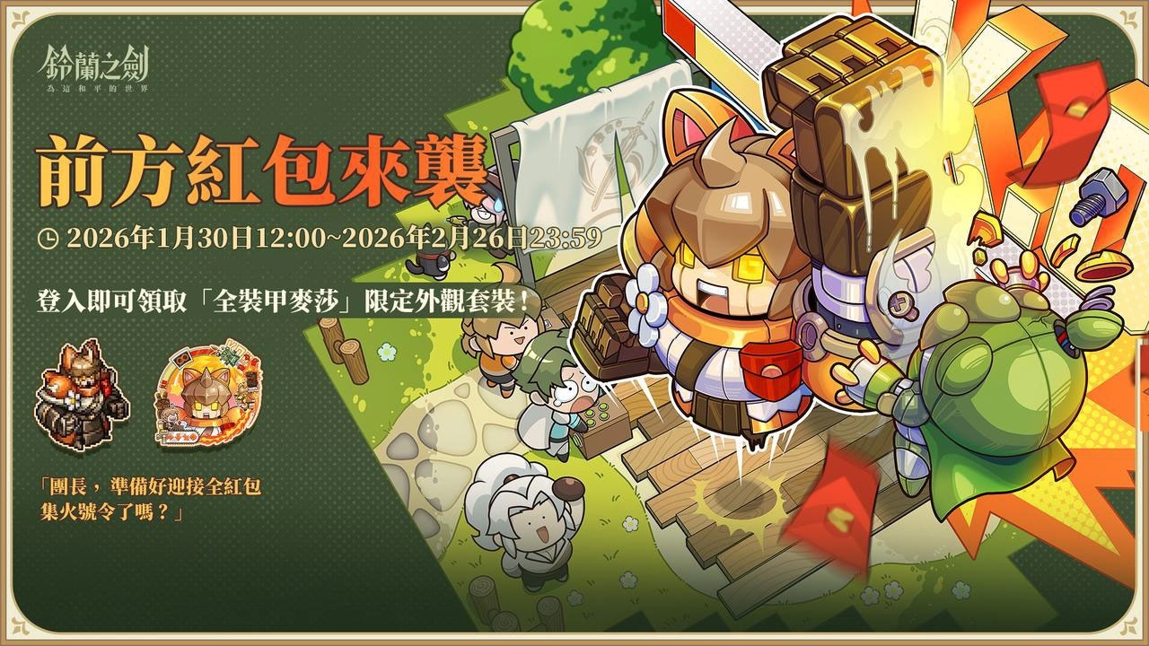 「團長,準備好迎接全紅包集火號令了嗎?」為迎接即將到來的春節,官方特別準備人氣角色「全裝甲麥莎」限定外觀套裝。活動期間內,玩家只要登入遊戲即可獲得,讓麥莎陪伴團長一同迎接嶄新的一年。