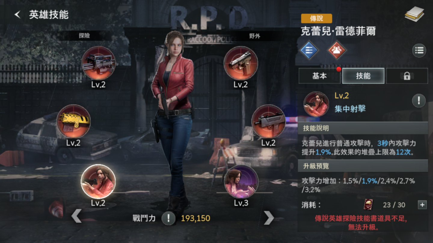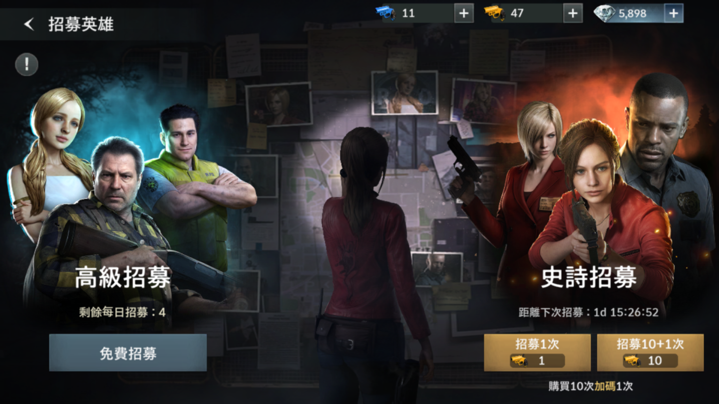 在遊戲初期,僅有推出五隻「傳說」角色,其中登入七天就能免費獲得「克蕾兒」以及專屬武器,強烈推薦大家培養這隻好取得,而且具備強力 BUFF 技能的角色,在各種環境中都很適用,如果不介意稍微花一點點小錢讓遊戲過程更舒服的玩家,也可以透過首儲獲得「吉兒」、累計儲值解鎖「艾達·王(Ada Wong)」,配合其他紫色品階的高星數角色,至少能夠順利推進到遊戲 Lv10 左右,將各項設施解鎖並且開始進到SLG經典的備戰階段。