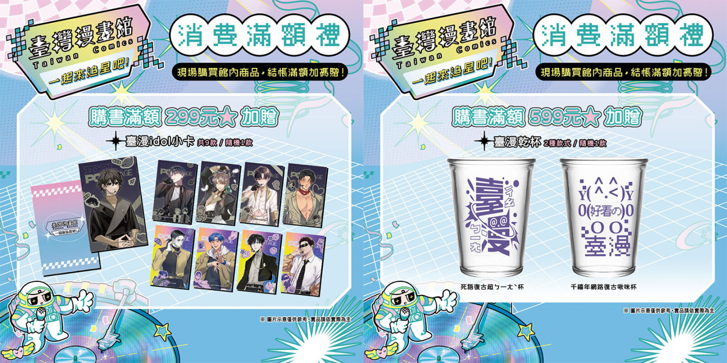除了四大展區更加碼寵粉,推出多項展場限定好禮,凡消費滿指定金額即可獲得「臺漫 idol 卡(9款)」、「臺漫乾杯」、「星光壓克力色紙」及「喜歡買買包」;完成指定互動任務者,更有機會獲得「臺漫 idol 卡(10款)」、「超級喜歡票卡套」、「TOP 台專輯造型 NFC 吊飾」等收藏級周邊,並有神秘好禮等你解鎖。「臺灣漫畫館」位於書展動漫輕小說專區,攤位號碼為 C212,誠摯邀請讀者一同進場應援,為持續發光的臺漫喝采,一起追漫、追星、追夢!