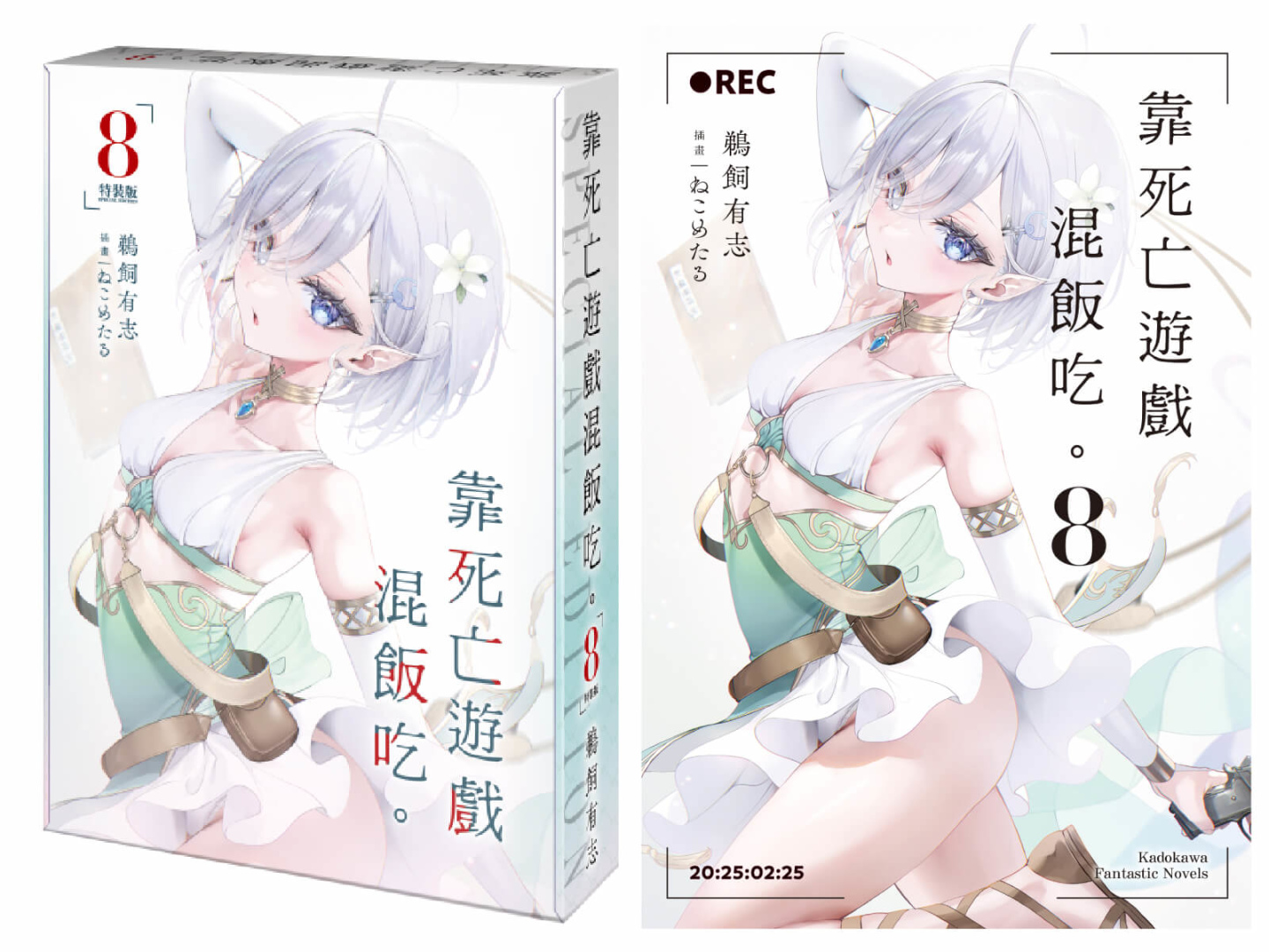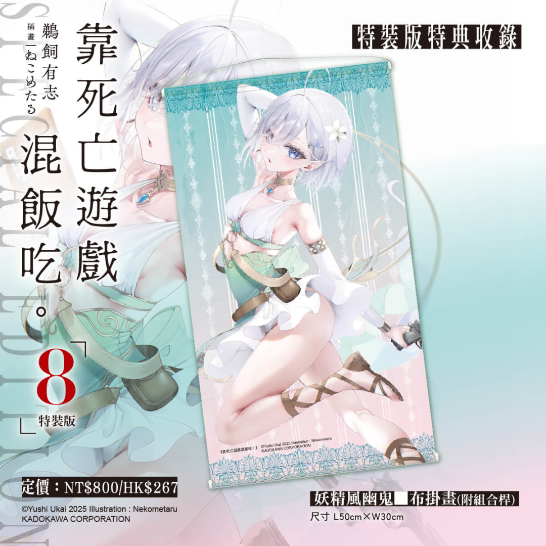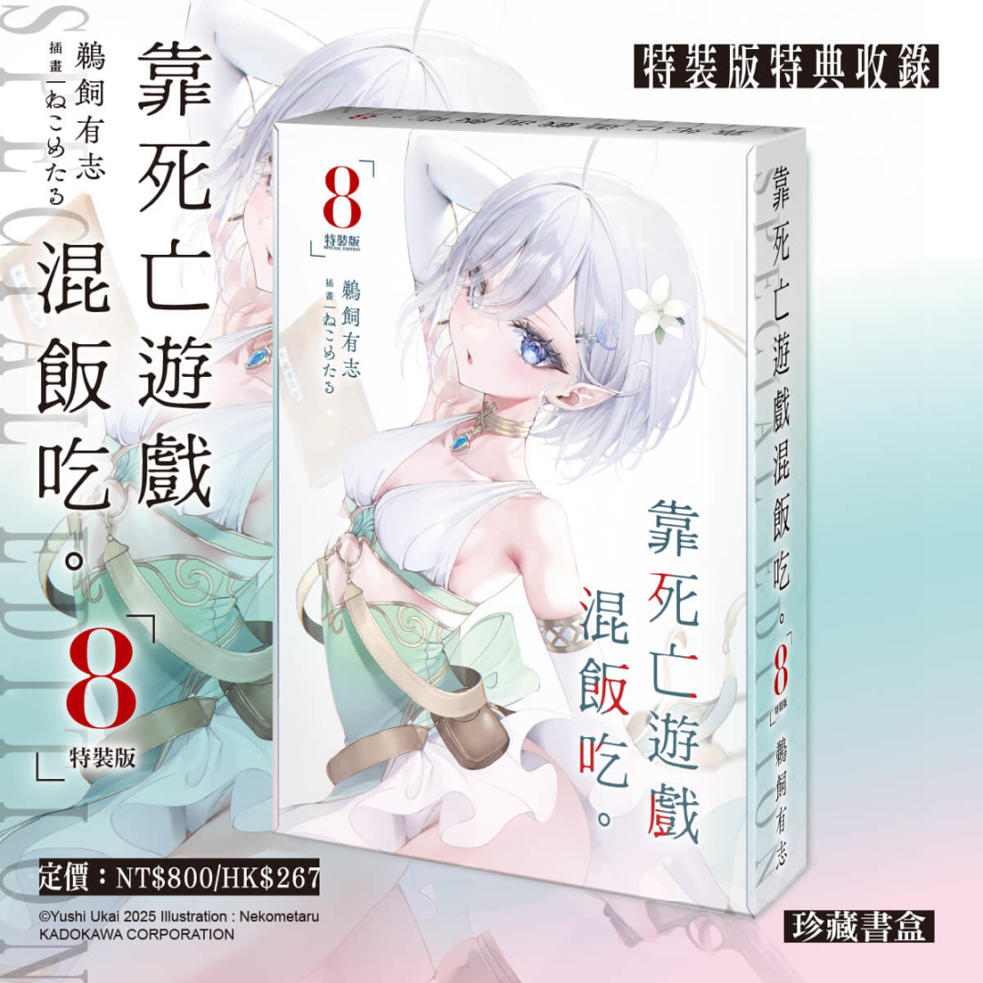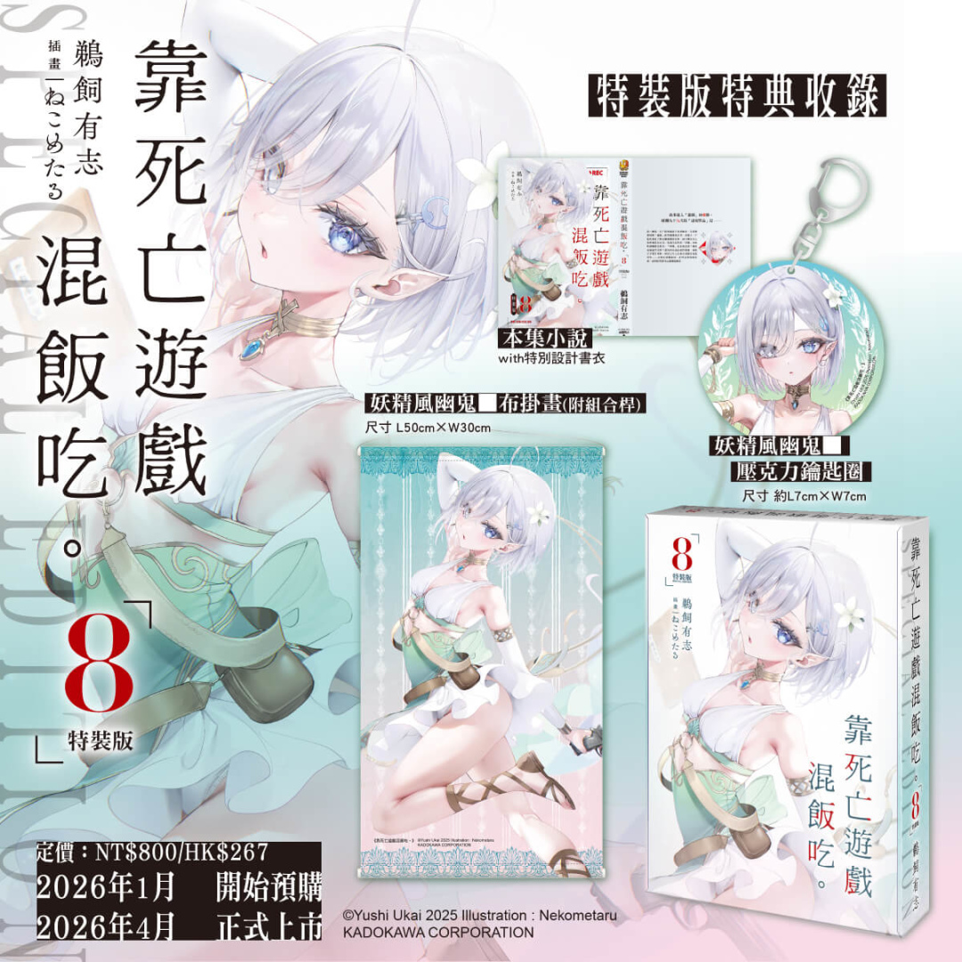 以獵奇美感狂虐清純可愛美少女玩家,創造極致反差爽感的話題輕小說《靠死亡遊戲混飯吃。》第八集特裝版收錄絕讚特典──「妖精風幽鬼布掛畫」及「妖精風幽鬼壓克力鑰匙圈」玩家幽鬼這次穿上甜美誘惑的俏皮妖精裝扮,小白花點綴紫白色髮絲,看似弱不經風的纖瘦身材與絕美臉孔令人怦然心動;特裝版限定特典與「特別設計書衣小說」收錄於「珍藏書盒」,自即日起開放全台指定通路事前預購至2/9(一),凡於台灣角川官網完成預購再加碼贈送滿額優惠券100元(每會員限使用/領取乙次,使用期限為60天)。讀者朋友敬請把握限期預購機會以免向隅。