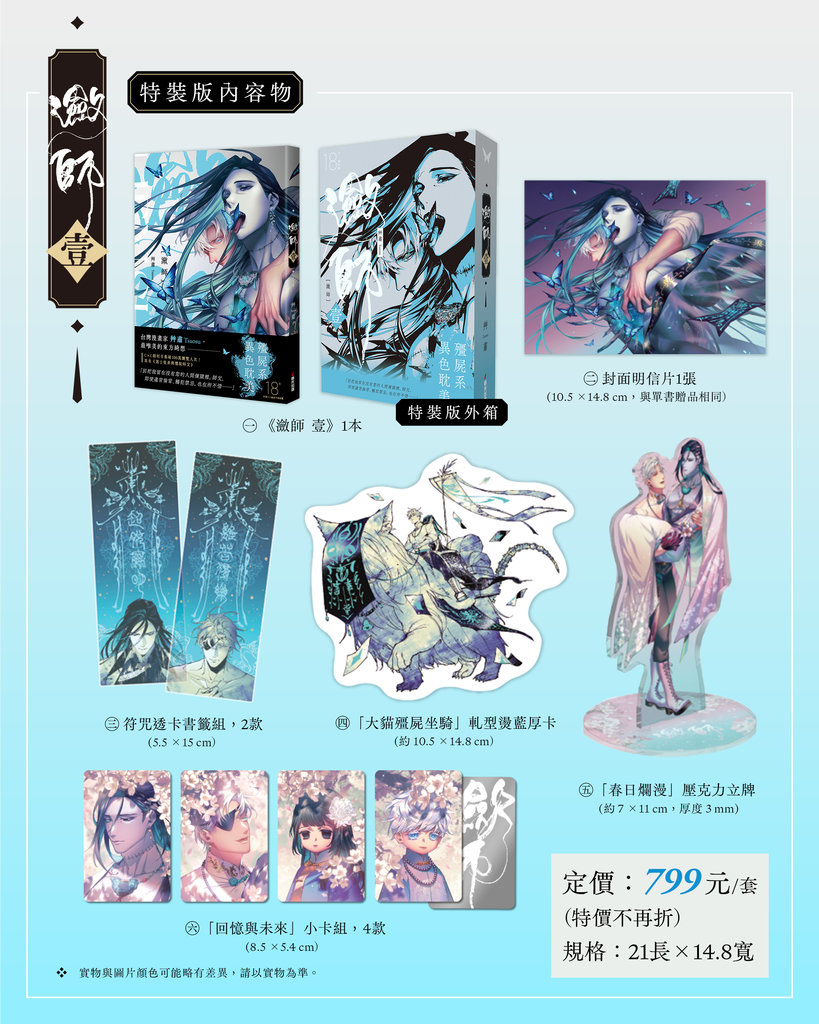 《瀲師》第1集同步推出一般版與限量特裝版。一般版附贈「封面明信片」1張,特裝版則收錄更多限定特典,除了「封面明信片」外,還包括2款符咒透卡書籤組、「大貓殭屍座騎」軋型燙藍厚卡、「春日爛漫」壓克力立牌、「回憶與未來」小卡組4款,以上全都精美收錄於「限量特裝版書盒」。《瀲師》第1集將於2月10日早上10:00在讀書花園、誠品、金石堂、博客來、MOMO、Animate安利美特、墊腳石開放限量預購,2月11日全面上市。