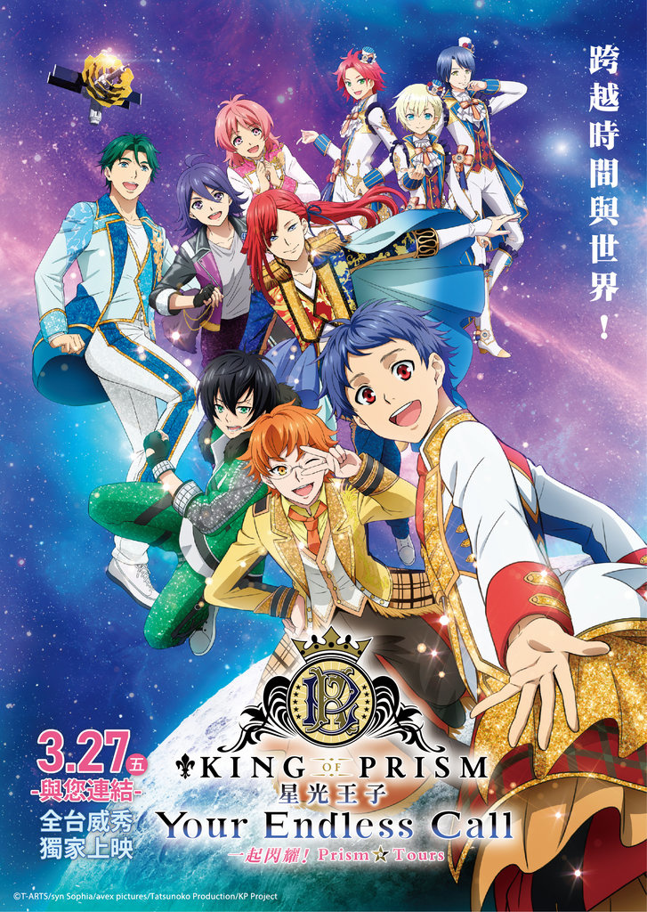 原創動畫影集《星光王子King of Prism》已正式邁入十週年,最新動畫電影《星光王子 Your Endless Call! 一起閃耀!Prism☆Tours》在日本已經破12億日幣票房,台灣地區將於3月27日(五)在全台威秀影城獨家上映!這部電影將帶來系列作品《星光少女》、《星光樂園》、《星光頻道》裡的Pretty Boys演出,還有之前星光時尚秀的「三強」演出,娛樂滿載,精彩可期!