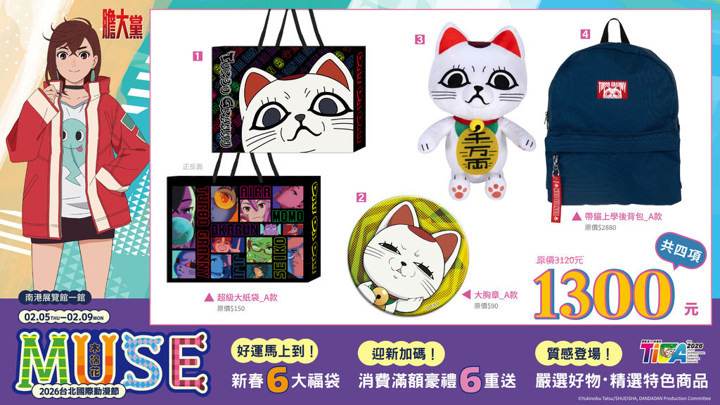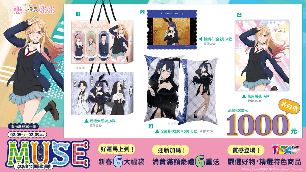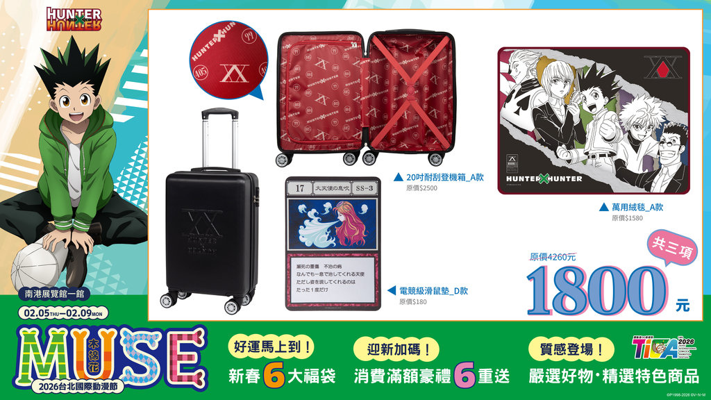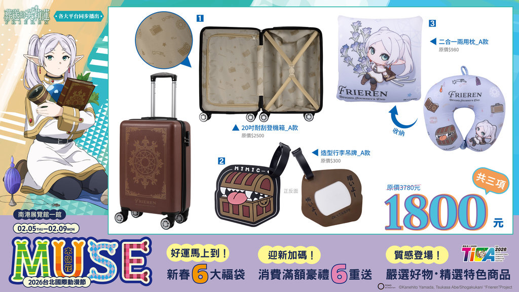 萬用絨毯、全彩抱枕、全彩拭鏡布及超級大紙袋,讓你一次擁有《戀上換裝娃娃》海夢的各種LOOK;《膽大黨》福袋中有高速婆婆貓型態絨毛玩偶跟超能裝的實用後背包;《Lycoris Recoil 莉可麗絲》以木棉花獨家的千束瀧奈俏麗格紋短裙特繪圖,帶來頭戴式藍牙耳機、長門簾與炫彩大胸章;《HUNTERxHUNTER 獵人》角色形象萬用絨毯、有著低調獵人協會LOGO的20吋耐刮登機箱,加上「大天使的氣息」電競滑鼠墊;《葬送的芙莉蓮》A款福袋的芙莉蓮和服掛軸加上頭戴式藍牙耳機,陪伴你生活中的一切起居大小事;B款福袋的二合一兩用枕、寶箱怪行李吊牌與魔導書外觀的20吋耐刮登機箱。兩款福袋一起擁有,讓《葬送的芙莉蓮》成為你居家出遊的最佳夥伴。