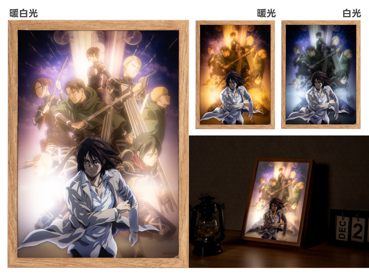可以調整三種燈光效果還能自由選擇亮度的燈光畫,充分展現《進擊的巨人 The Final Season》中,艾連與兵團眾人的帥氣英姿;戀上換裝娃娃》這次帶來黑江雫造型的布掛畫,與十六夜亞里紗造型的30公分壓克力立牌,快把喜歡的海夢帶回家。