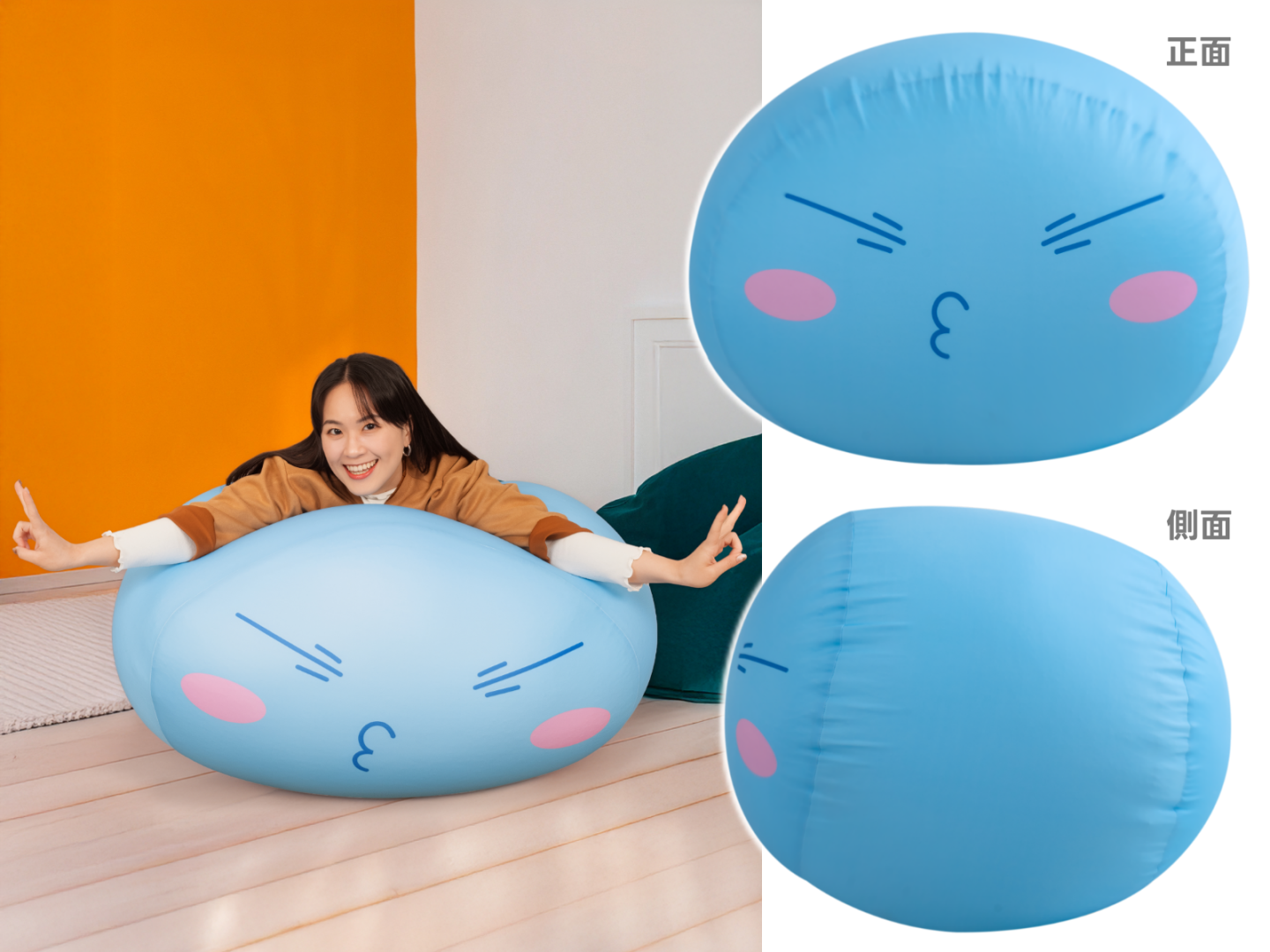 《關於我轉生變成史萊姆這檔事》大型的史萊姆造型懶人墊,外層是舒爽涼感布套,內裡的填充物可隨著體型輕鬆變化,既柔軟又舒適,要當作坐墊靠墊都可以,就像是每天都有利姆路大人的守護陪伴一樣,快來搶鮮預購吧!