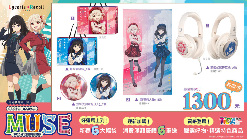 動漫節期間無法親自來到南港展覽館現場的話,木棉花的台北地下街門市、台中一中街門市、2月1日新開幕的高雄一番街門市,以及線上商城(木棉花樂園\蝦皮商城),福袋及首發新品都會同步限量發售(實際販售商品以平台顯示為主);線上商城更有專屬回饋,消費滿千可抽《Lycoris Recoil 莉可麗絲》單寧托特包。在台北國際動漫節木棉花攤位結帳時出示木棉花樂園會員條碼,最高可享3%紅利回饋。