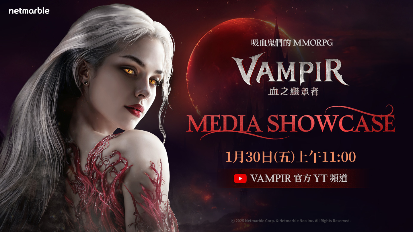 遊戲開發與發行商的網石集團(Netmarble Corporation)宣布,旗下即將登場的大規模吸血鬼風格MMORPG《VAMPIR:血之繼承者》將於1月30日上午11時,在2026台北國際電玩展舞台區舉辦官方發布會。現場將由韓國開發團隊深入介紹遊戲特色並進行玩家互動問答等環節,更邀請知名實況主丁特、小許與文老爹等8人共襄盛舉,歡迎所有期待的玩家一同踏上暗黑的吸血鬼世界!
