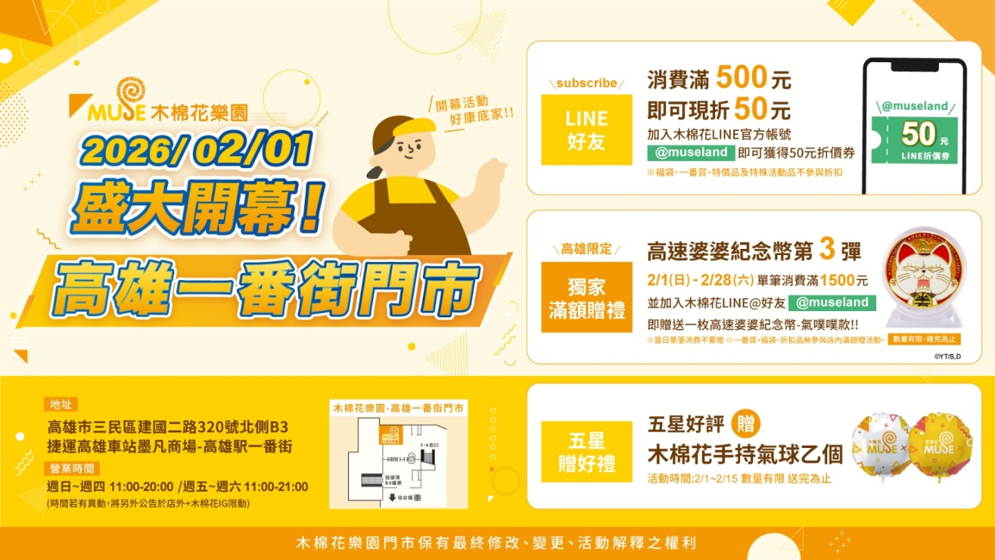 活動日期:2月1日至2月15日,開幕首兩週,只要在門市留下五星好評,即可免費獲得MUSE木棉花手持氣球乙個,送完為止。