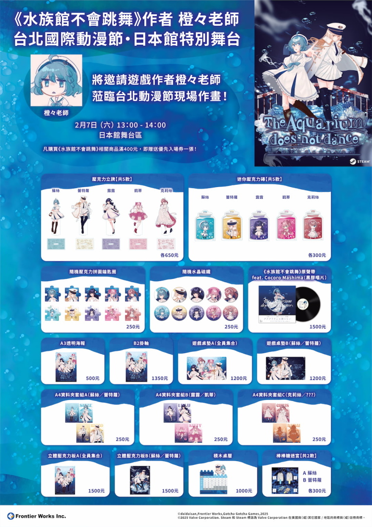 在 Frontier Works 攤位,我們將展示現正於 Nintendo Switch 與 Steam 平台上熱賣中的解謎恐怖冒險遊戲《水族館不會跳舞(アクアリウムは踊らない)》並販售相關周邊商品、舉辦贈禮活動。相關資訊請看此篇報導。