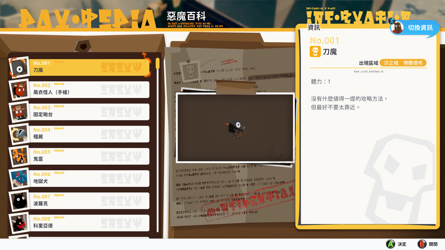 本作的敵人多達 80 種以上,並非單純換色設計,而是各具特色且擁有不同的行動機制。從偽裝成寶箱或道具的敵人,到即使被破壞仍會自行再生的特殊屬性,挑戰各式各樣的戰鬥。收錄敵人資訊的「惡魔百科」中,不僅能確認名稱,還能查看其狀態與詳細資料。