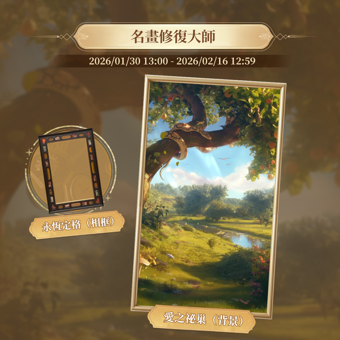 活動說明:在「名畫修復大師」玩法當中,玩家需透過交換拼圖位置,復原經典畫作。成功完成畫作的修復後,即可獲得「永恆定格」相框與「愛之祕巢」背景,感受親手重現藝術的榮耀時刻。