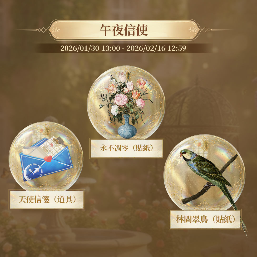 活動說明:於「午夜信使」活動中,玩家可透過「遺失的畫筆」來解鎖神祕信件,並隨著信件解鎖封數的增加,獲得「永不凋零」、「林間翠鳥」等藝術主題限定貼紙,收藏名畫化作的細膩情感。