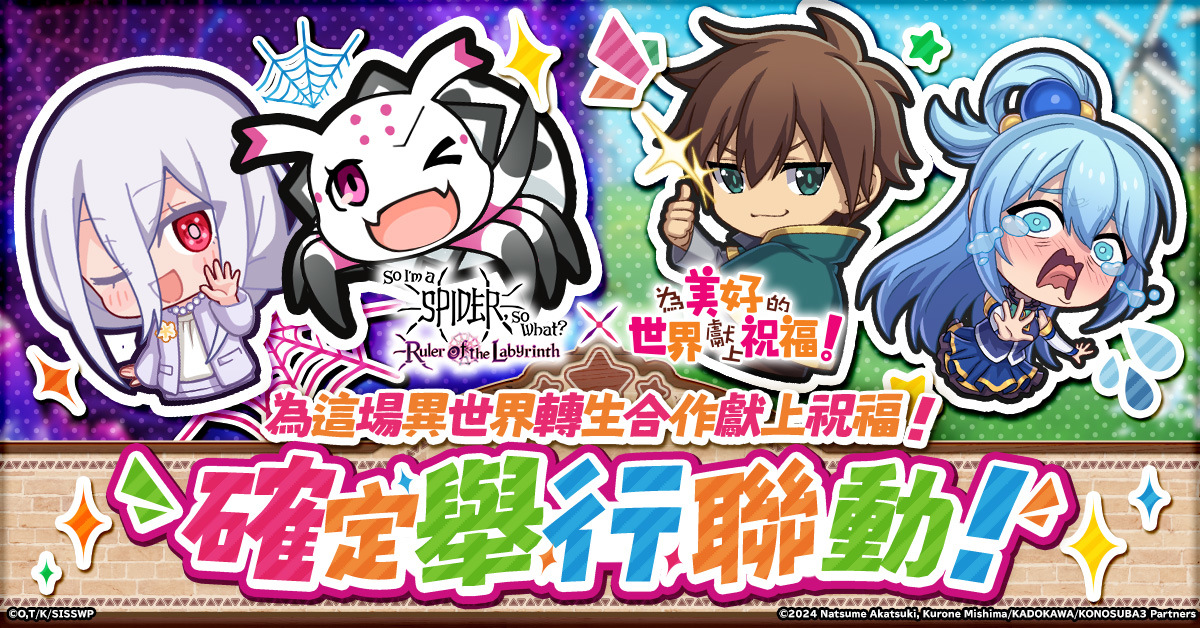 CTW株式會社宣布,火熱上線中的網頁遊戲《轉生成蜘蛛又怎樣!迷宮的支配者》將與動畫《為美好的世界獻上祝福!》舉辦聯動活動。 活動期間:2026年2月13日(五)~2026年3月5日(四)