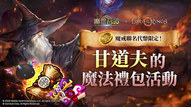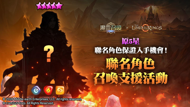 韓國手遊大廠Com2uS旗下經典作品《魔靈召喚》和全球知名小說《魔戒™》的聯名活動正式開跑!《魔戒™》知名角色如佛羅多、甘道夫、亞拉岡、勒苟拉斯以及咕魯都將來到天空之島,為紀念史詩級聯名,官方推出多重活動以及送出豐富獎勵,包含5星佛羅多、神秘召喚書100張以及多張聯名限定召喚書!除此之外,於活動期間累積召喚點數還可免費隨機召喚一隻5星聯名角色。