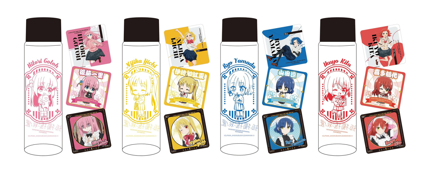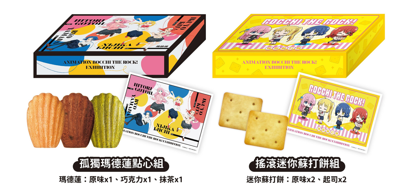 「《孤獨搖滾!》動畫展」場外特別規劃輕食區,提供來場消費者點心組及風味冷泡茶選擇,玻璃瓶身可重複利用,吸睛又環保,購買冷泡茶贈送專屬款角色卡,每款角色3款設計,快來蒐集!點心組特別規劃「孤獨瑪德蓮點心組」「搖滾迷你蘇打餅乾組」,盒內附炫光收藏卡,更適合粉絲專屬收藏!