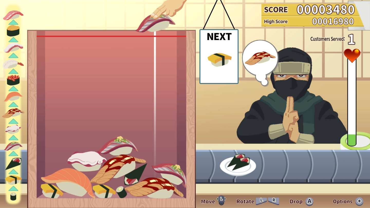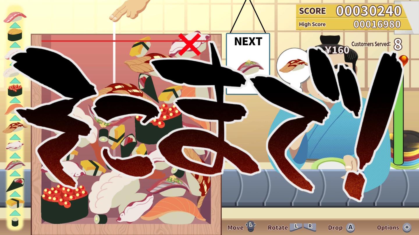 身為壽司職人的你,需要不斷將壽司投放進箱子裡,使相同的壽司碰撞合併,從而捏出更加豪華的壽司。