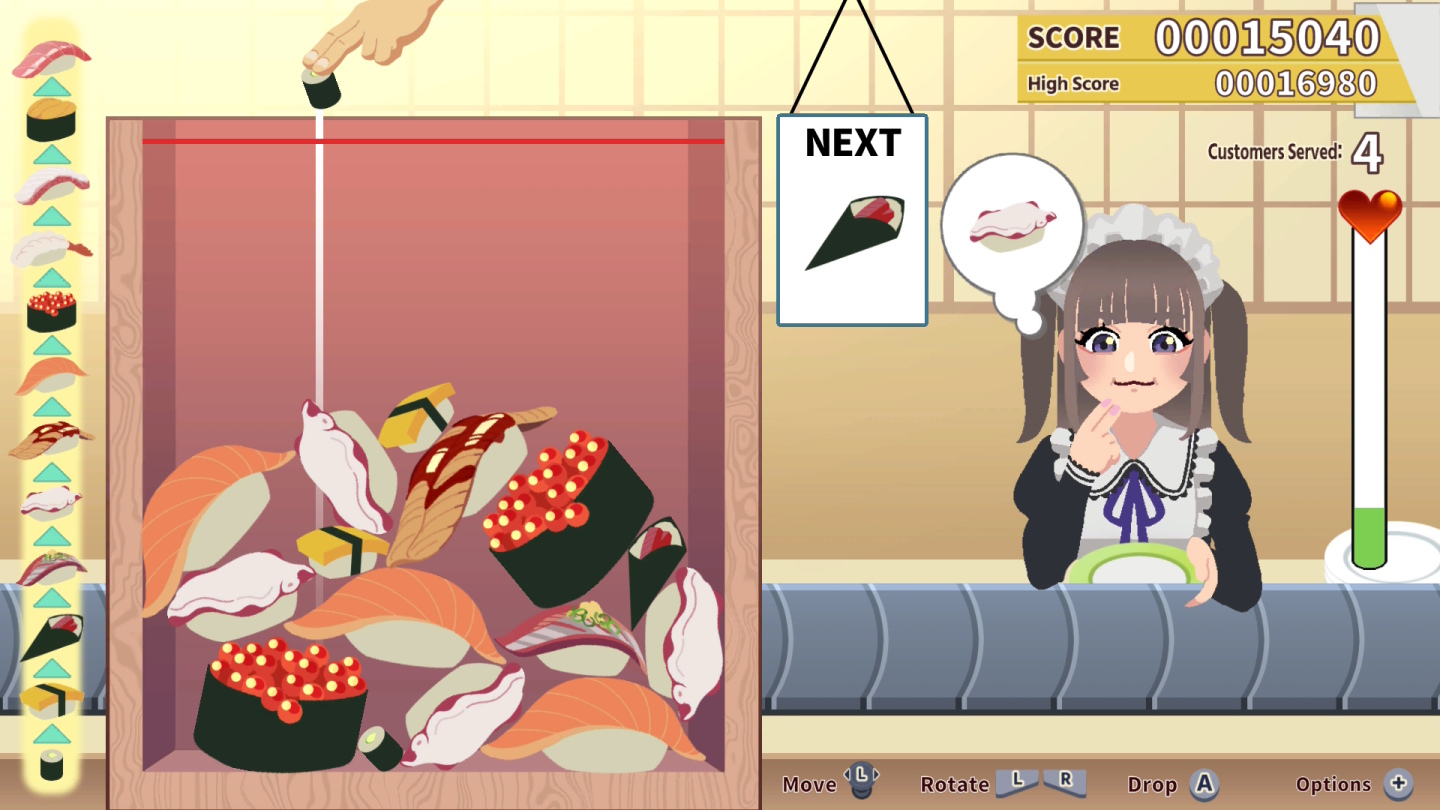 《SUSHI BAR MOEBIUS》是一款已在Steam平台廣受好評的下落式物理益智遊戲。玩家需要操控壽司不斷下落,使相同的壽司相互碰撞並合併,最終目標是合成傳說中的「金槍魚大腹」。