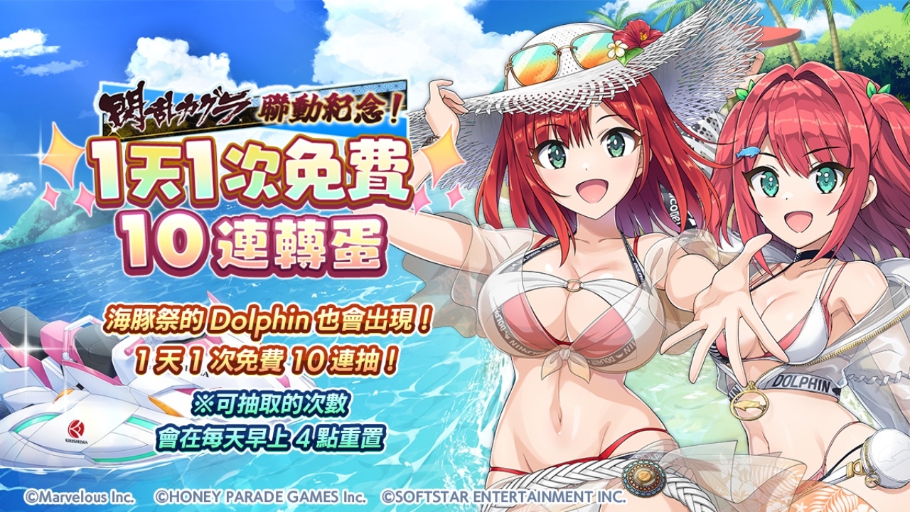 為紀念本次聯動活動,遊戲內將於 2 月 4 日維護後至 2 月 11 日 03:59 止,開放期間限定特別轉蛋「1 天 1 次免費 10 連轉蛋」。活動期間內最多可進行 7 次免費 10 連抽取,有機會獲得海豚祭限定海豚。