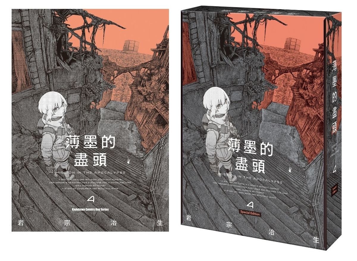《薄墨的盡頭 (4)》封面及「特裝版珍藏書盒」以主角小夜持續探索末日世界為核心,展現堅韌的意志和信念。特裝版收錄限定特典,包括「名場面書卡4入組」為小夜在執行任務時遇見的景象;以及「壓克力立牌」呈現她獨自感受人類曾經存在過的片刻,讓讀者一次收藏《薄墨的盡頭》中美麗而寂靜的末日景致。