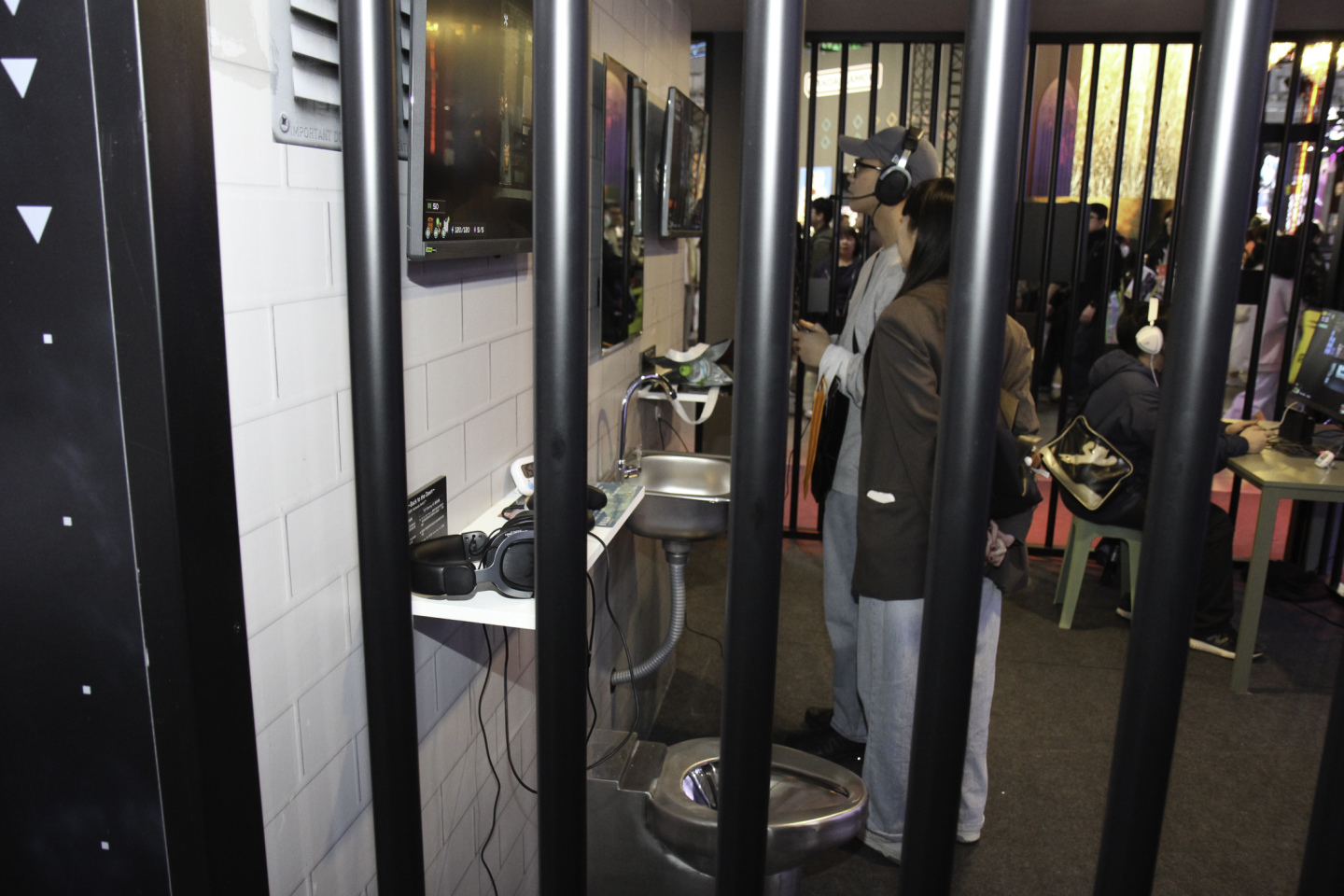 仲村:對細節非常講究。像那種牢房,我原本以為會做得更簡陋一點。我有試著用力推推看那個牢房,是真的牢房。那裡真的很厲害。裡面也做得像監獄一樣,馬桶沒有蓋子,還有洗手台之類的,非常棒。看到大家忘我地玩遊戲的樣子我也很開心。排了很多人,外面的大螢幕也很棒,讓我非常感動。