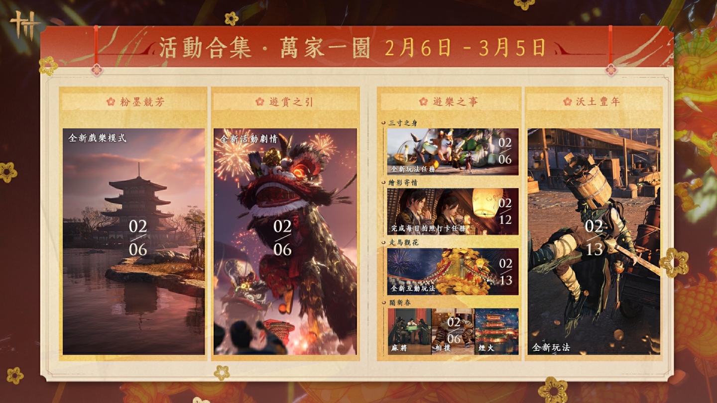 年關將近,江湖大地將被紅燈籠與爆竹聲環繞,洋溢熱鬧的煙火氣息。自 2 月 6 日起,「萬家一園」新春系列活動將會陸續開放,全新玩法:三寸之身、鬧新春、繪影寄情、走馬觀花,也將在活動期間限時開放,無論是喜歡單人遊玩或多人同樂的遊俠們,都可以在歡樂時光中開心過年!