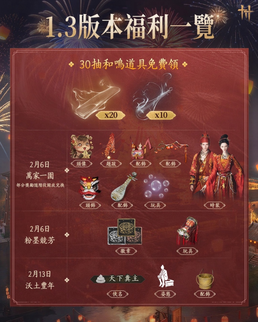 新春活動期間獎勵多多,時裝、頭像、配飾、徽章、姿態等限時福利等你領取,還可免費獲得高達 20 個「裊裊之音」以及 10 個繞梁之音!喜愛收集絕美時裝、打造個人獨特穿搭的玩家,絕對不能錯過這次的大好機會!
