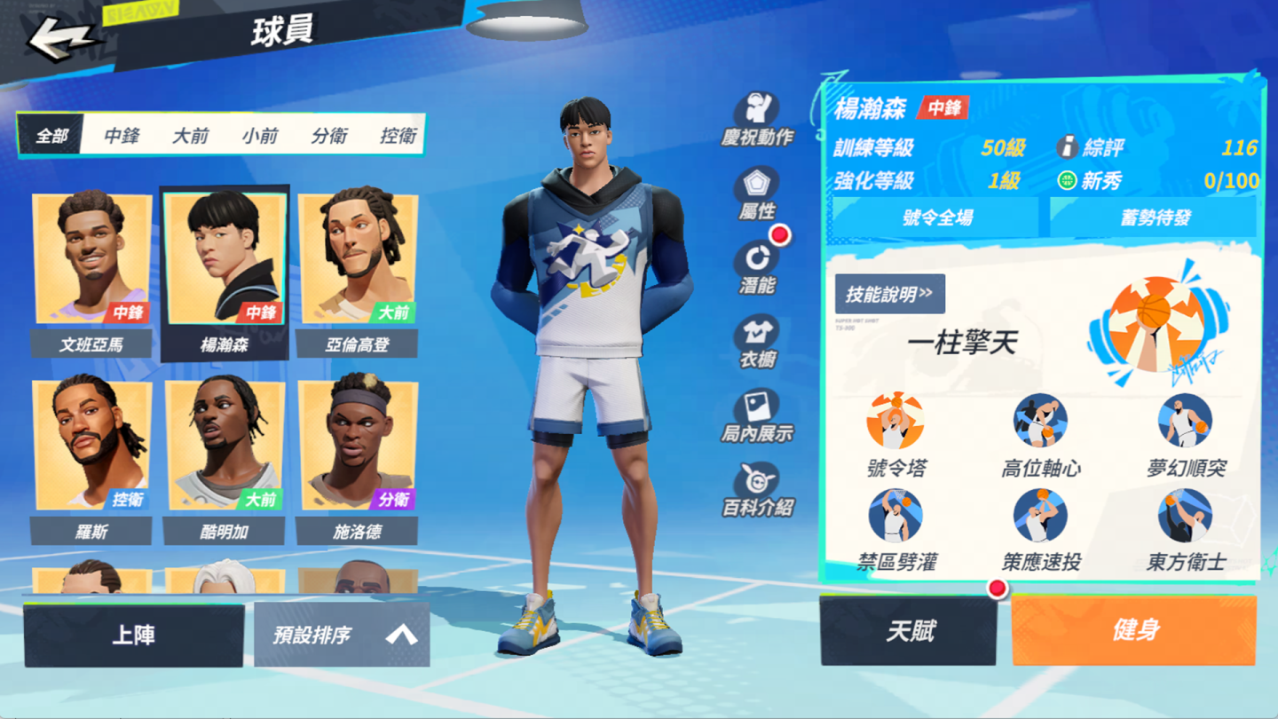 能小幅提升籃板範圍、競爭值及卡位移動速度。長按「指揮樞紐」進入蓄力狀態後,不僅傳球速度與命中率會隨時間增加,還能使全體隊友空手跑位速度大幅提升,且自身免疫抄截。防守端能透過「專注爭板」蓄力,可持續強化卡位與籃板屬性,蓄力短暫秒數後更具備不會搶板受阻的特性。此外,技能也具備極佳的靈活性,允許在突破後段以傳球打斷動作,達成機率性的擊地傳球。最後,當觸發「靈光乍現」狀態時,楊瀚森的三分命中率與安全傳球距離將獲得小段時間爆發性增長。