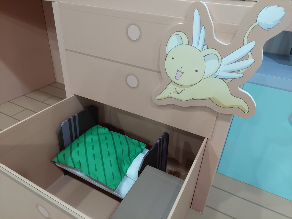 本次快閃店精心打造多處動畫經典場景,讓人彷彿走進故事中的某個片刻。包含 「小櫻的房間」,特別製作小可睡覺的抽屜,細膩還原小可的專屬小天地;「小櫻與小狼一同前往的水族館」,以靜謐藍色調營造兩人回憶中的溫柔氛圍;以及 「友枝中學的花園穿廊」,重現小櫻、小狼與知世經常討論事情的日常場景,讓人不自覺放慢腳步。