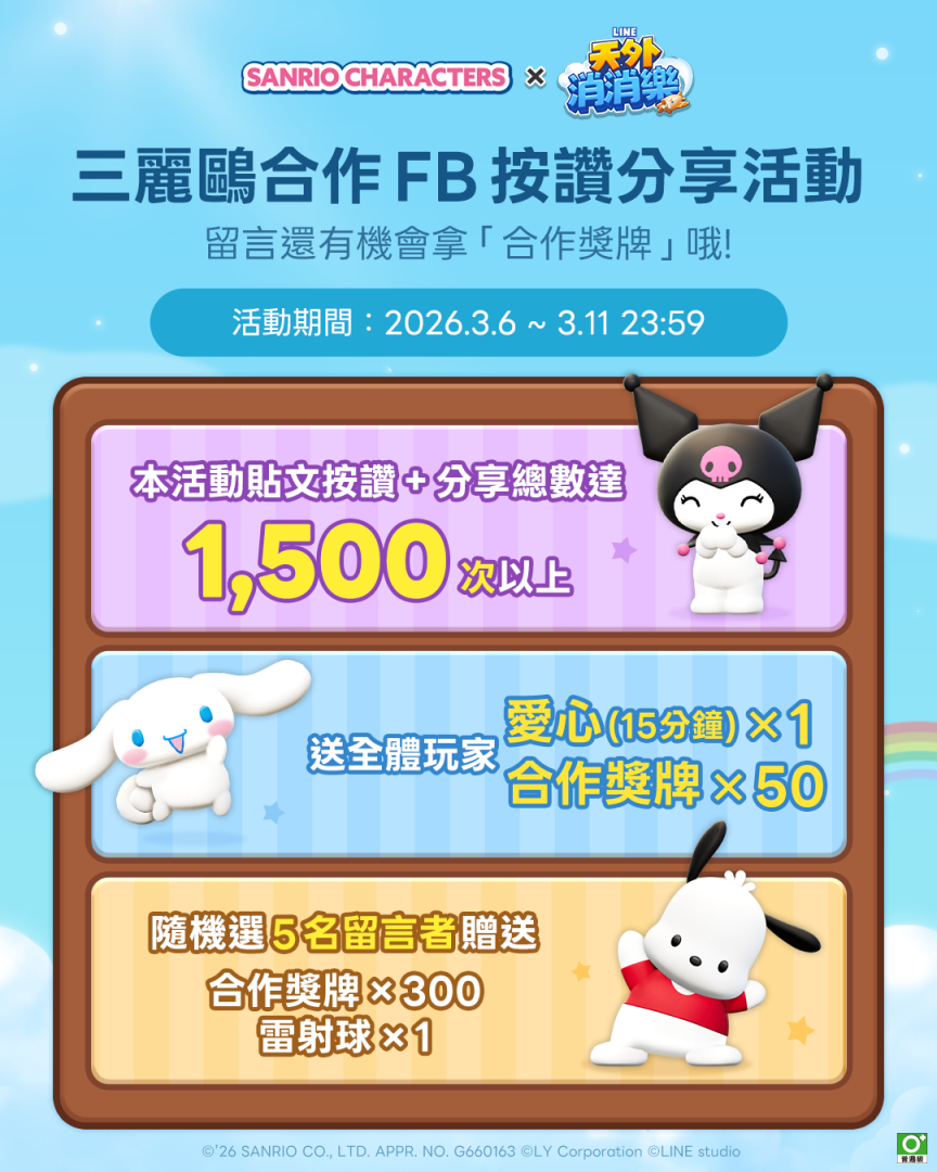 為了慶祝本次合作,「LINE GAMETaiwanFacebook官方粉絲團」將舉辦貼文按讚分享留言活動,送上紀念好禮,幫助玩家通關更加順利!活動期間內,只要於「LINE GAMETaiwanFacebook官方粉絲團」指定貼文的按讚+分享次數總計達1,500次以上,全體玩家將獲得「愛心(15分鐘)」及「合作獎牌x50」的特別獎勵!若玩家參與「公開分享貼文」並於貼文下方「留言寫下你最喜歡的三麗鷗明星家族角色」,還有機會再獲得「合作獎牌x300」以及「雷射球x1」的幸運獎勵!把握機會快來參加吧!