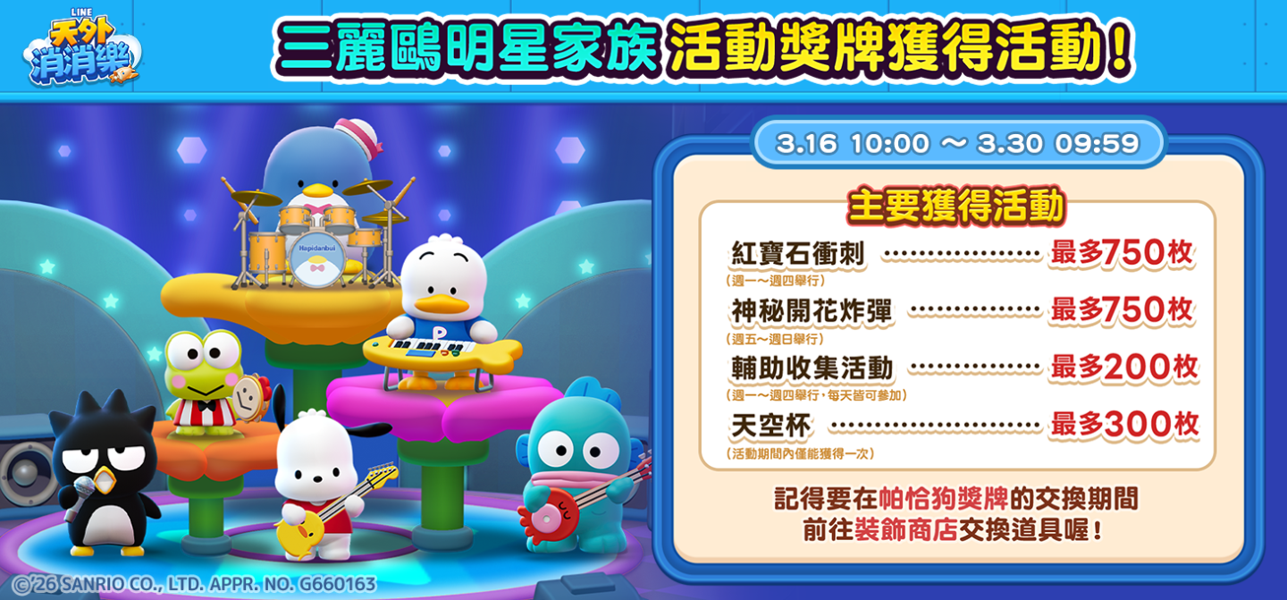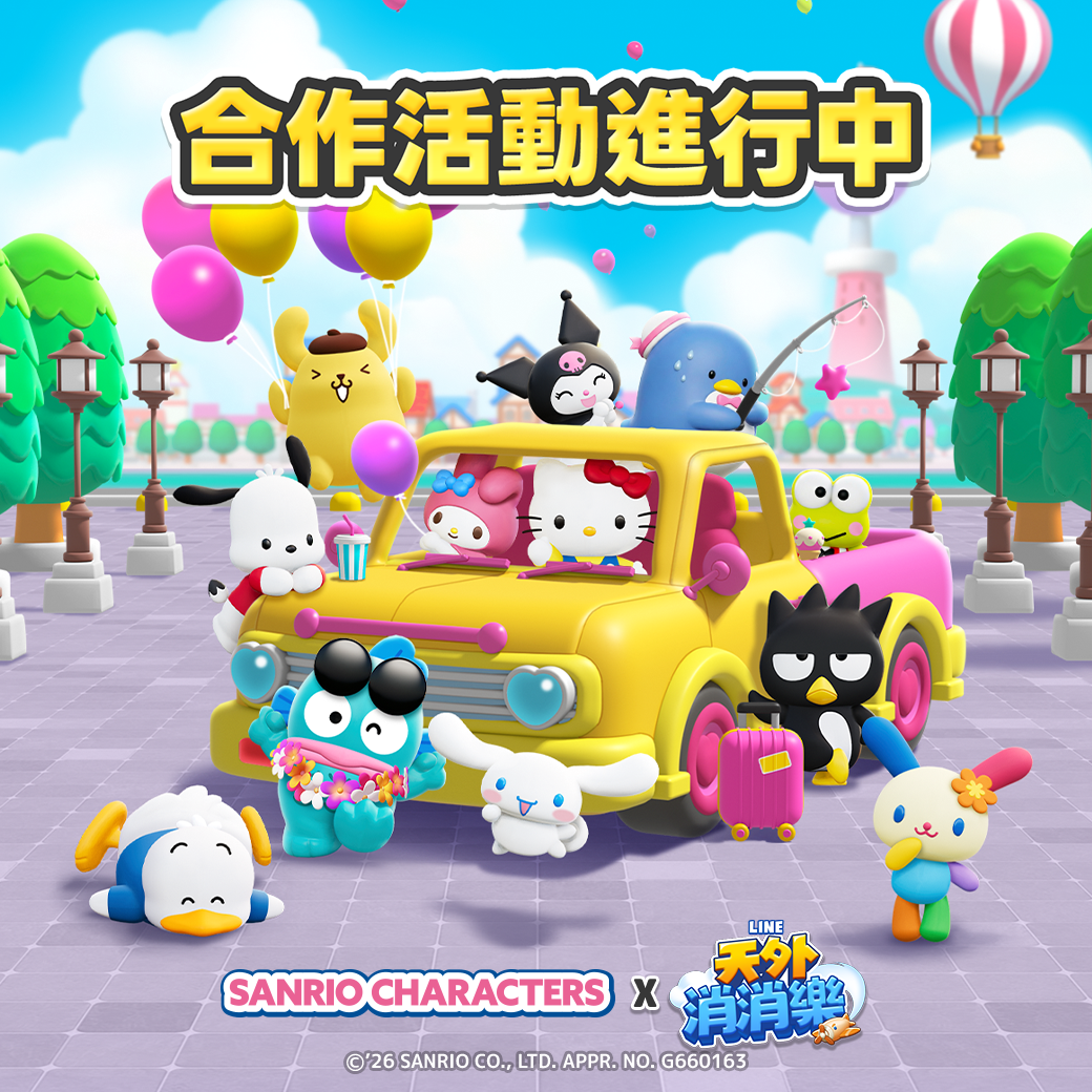 LINE GAME全新三消益智手遊《LINE 天外消消樂》(適用iPhone・Android/免費下載),今(3)日起將與「三麗鷗明星家族」展開合作活動!活動期間內,包含「布丁狗」、「大耳狗喜拿」、「帕恰狗」、「酷洛米」、「Hello Kitty」、「美樂蒂」、「人魚漢頓」、「大眼蛙」、「酷企鵝」、「山姆企鵝」、「貝克鴨」、「花小兔」等三麗鷗明星家族成員都會在遊戲中登場!玩家透過參與並完成各種合作限定活動與任務,就能獲得期間限定背景故事與個人資訊圖片、外框等眾多獎勵。歡迎各位玩家踴躍參與《LINE 天外消消樂》和「三麗鷗明星家族」的合作活動!