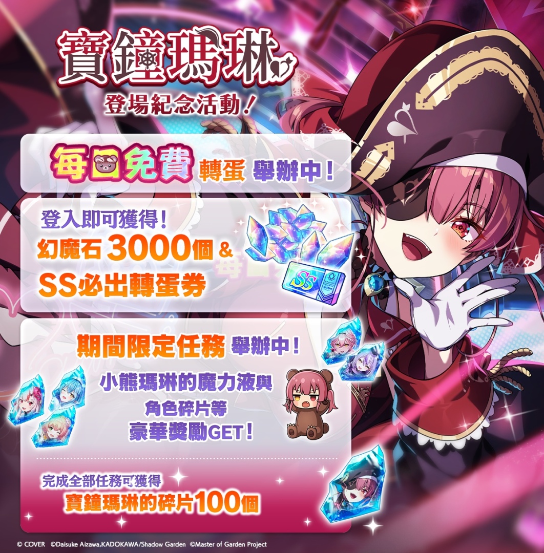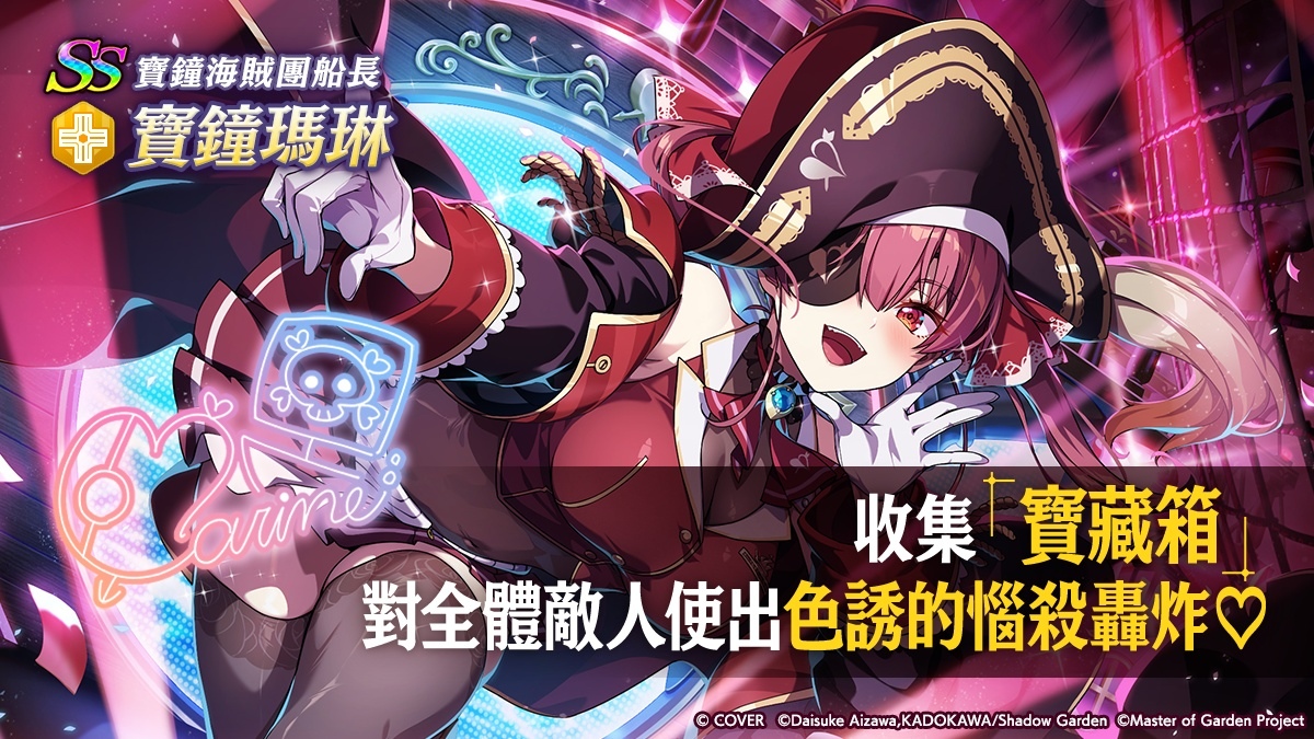 身為 hololive 三期生代表成員,同時也是「寶鐘海賊團」船長的寶鐘瑪琳,以活潑奔放的個性與高人氣深受粉絲喜愛。本次將以聯動限定角色之姿加入《我想成為影之強者!Master of Garden》,並搭配專屬劇情活動登場,帶來不同以往的冒險體驗。