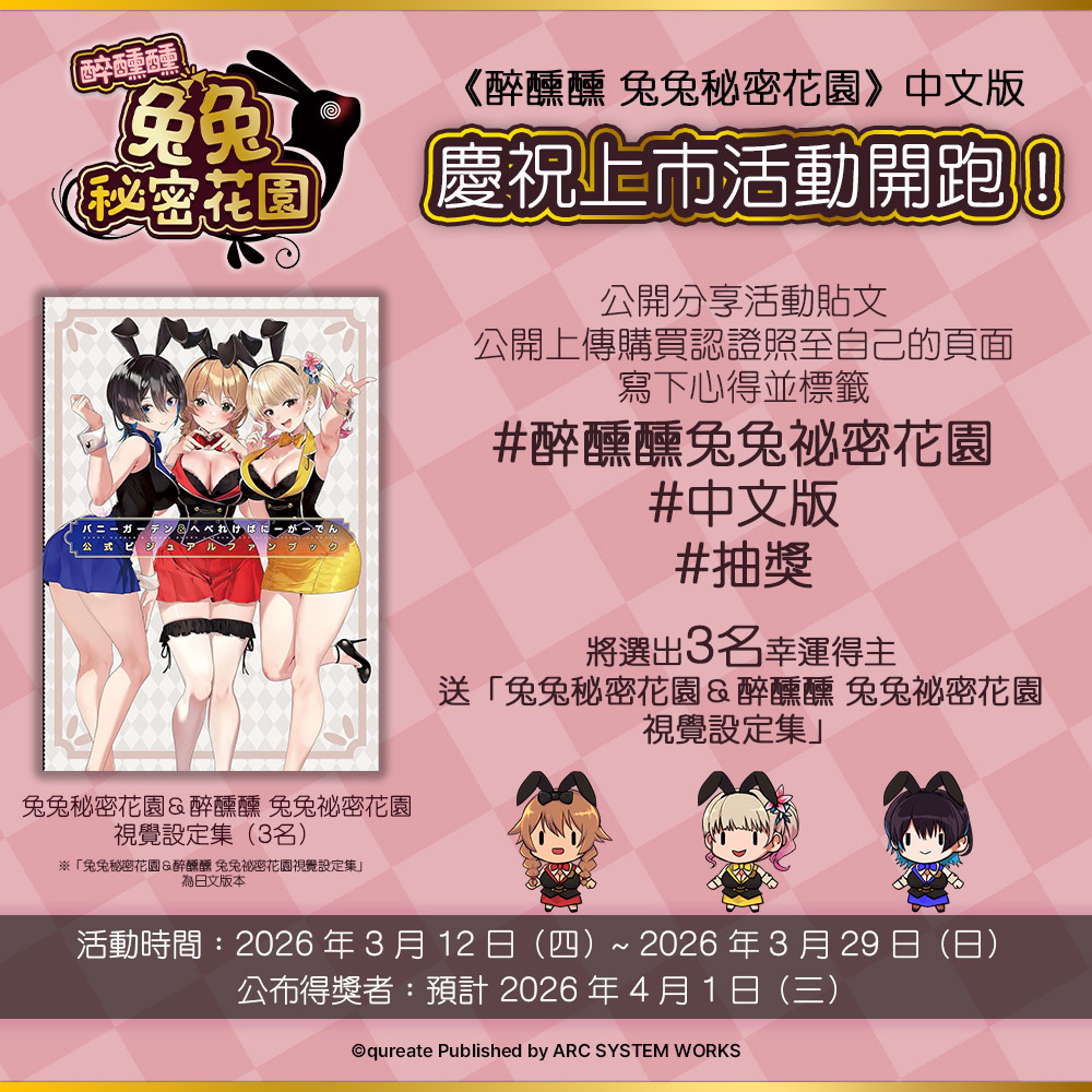 為慶祝《醉醺醺 兔兔秘密花園》中文版上市,從今天起舉辦抽獎活動。公開上傳中文實體盒裝版購買認證照或是遊玩遊戲的畫面並留下關於本作的感想,就有機會得到「兔兔秘密花園&醉醺醺 兔兔祕密花園視覺設定集」。抽獎活動詳情如下。