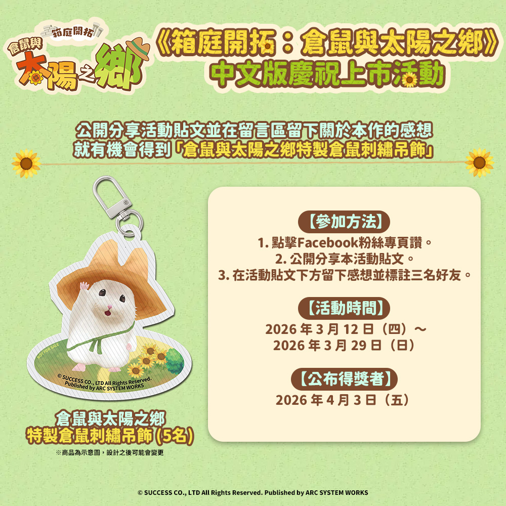 為慶祝《箱庭開拓:倉鼠與太陽之鄉》中文版上市,從今天起舉辦抽獎活動。公開分享活動貼文並在留言區留下關於本作的感想,就有機會得到「倉鼠與太陽之鄉特製倉鼠刺繡吊飾」。