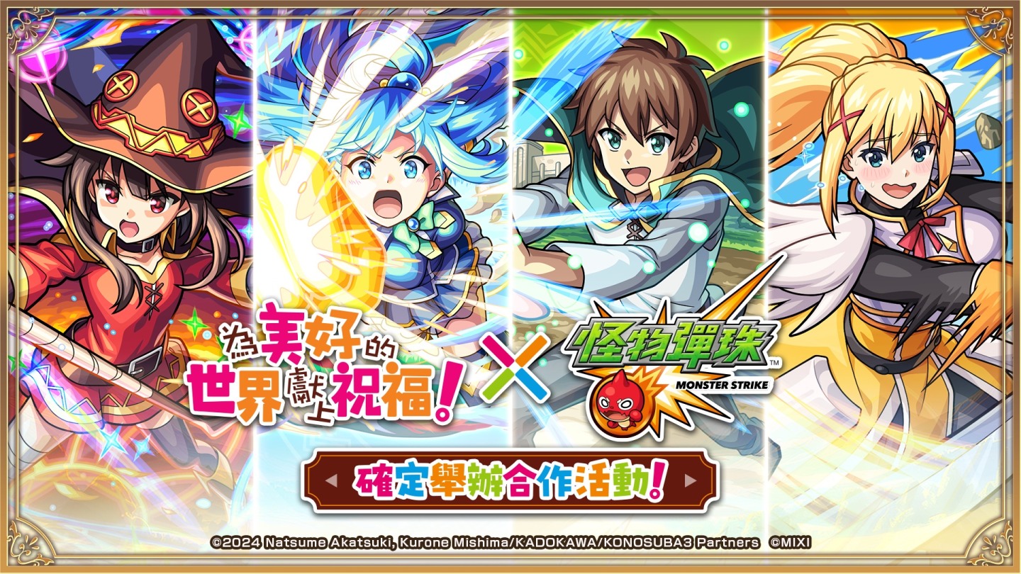 一拉一放戰鬥RPG手機遊戲《怪物彈珠》與動畫《為美好的世界獻上祝福!》的首次合作活動將於3月15日(日)12:00起開跑!「和真」、「阿克婭」、「惠惠」、「達克妮絲」全員登場,登入遊戲還可獲得1體★6合作角色!來到《怪物彈珠》的角色們將經歷怎樣有趣的冒險,邀請各位彈珠好手一起踏上這趟只有歡樂的異世界之旅吧!