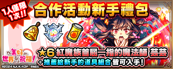 購買「動畫《為美好的世界獻上祝福!》合作活動新手禮包」,就能以運氣5&等級「極」&「+值」MAX狀態獲得「紅魔族首屈一指的魔法師芸芸(★6)」。此外,還能獲得任選鈴及體力罐等推薦給新手的道具組合!「紅魔族首屈一指的魔法師芸芸」只能透過合作活動新手禮包入手,每人限購1次!