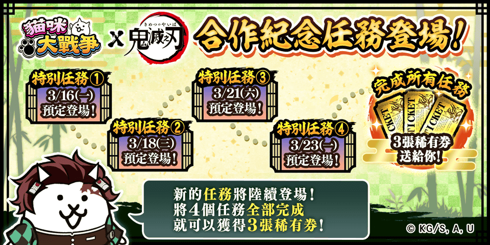 PONOS株式會社(京都府京都市)所開發的手機APP遊戲《貓咪大戰爭》將與動畫《鬼滅之刃》舉辦合作活動,活動於2026年3月13日(五)11:00開始。