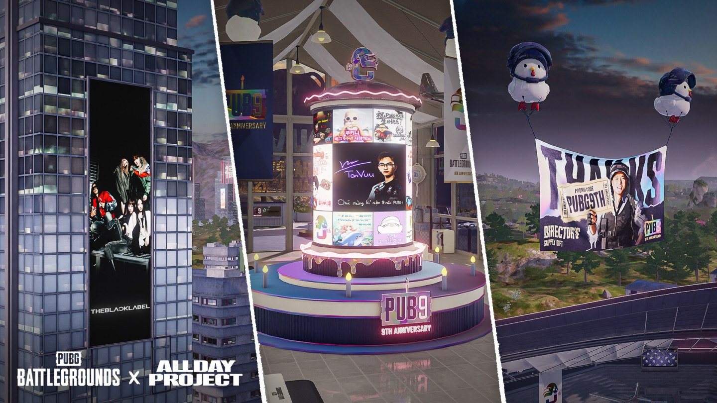 在起始島嶼上,玩家可以與 9 週年紀念雕像進行互動。若對雕像投擲全像閃光彈並達成 9 次命中,雕像將變成生存者的角色外型;天空中則有絢麗的無人機燈光秀演出。生存者現在只需登入即可獲得「特殊通行證:All Day 派對」,透過完成任務可贏得 ALLDAY PROJECT 聯名道具、表情動作、G-Coin 及 BP 等豐富獎勵。