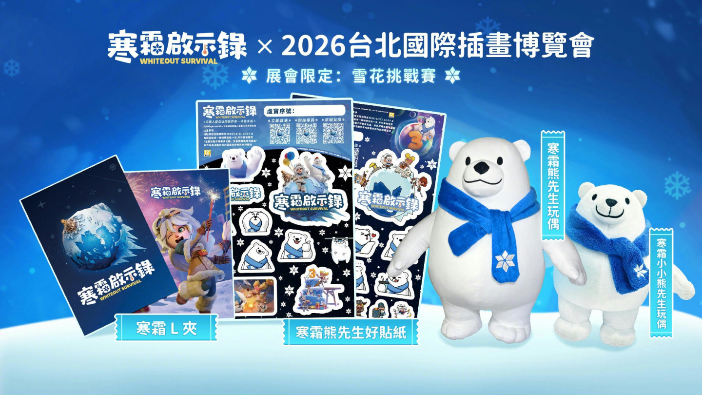 由 Century Games Pte. Ltd.推出,杰遊有限公司發行的冰雪末日生存策略手機遊戲《寒霜啟示錄》(Whiteout Survival)在三周年慶祝期間悄悄離開領地,帶著「熊先生的雪國相冊」宣布參展2026 台北國際插畫博覽會,邀請領主把在 4 月 2 日至 5 日,一起前往台北花博爭豔館 C-602 攤位,把美好回憶與限定周邊通通打包帶走!