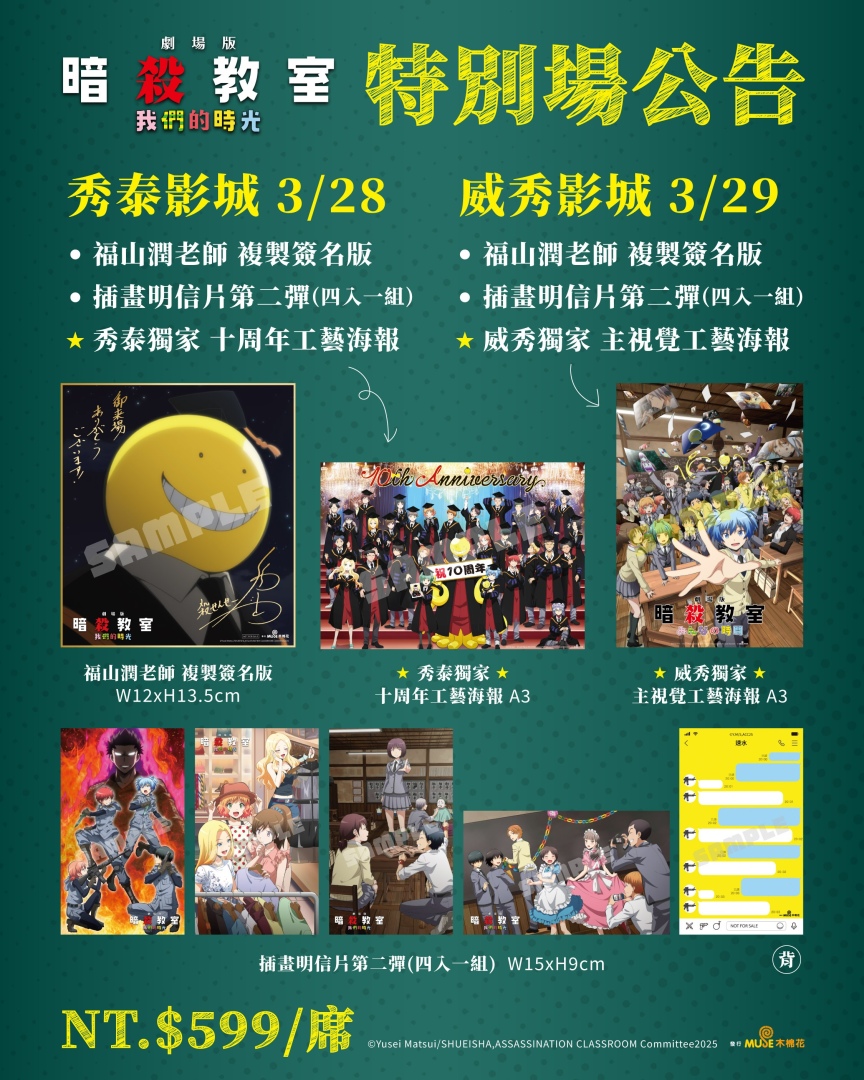 此外,自上映首日(3 月 27 日)起,部分影城將設置《劇場版「暗殺教室」:我們的時光》收藏卡機及扭蛋機台。威秀影城更推出獨家活動,凡憑《劇場版「暗殺教室」:我們的時光》電影票乙張,即可獲得「角色名言書籤」乙張,並首度開賣《劇場版「暗殺教室」:我們的時光》角色壓克力牌。更多《暗殺教室》相關周邊商品也將於 4 月 3 日至 4 月 6 日在台中動漫節登場。