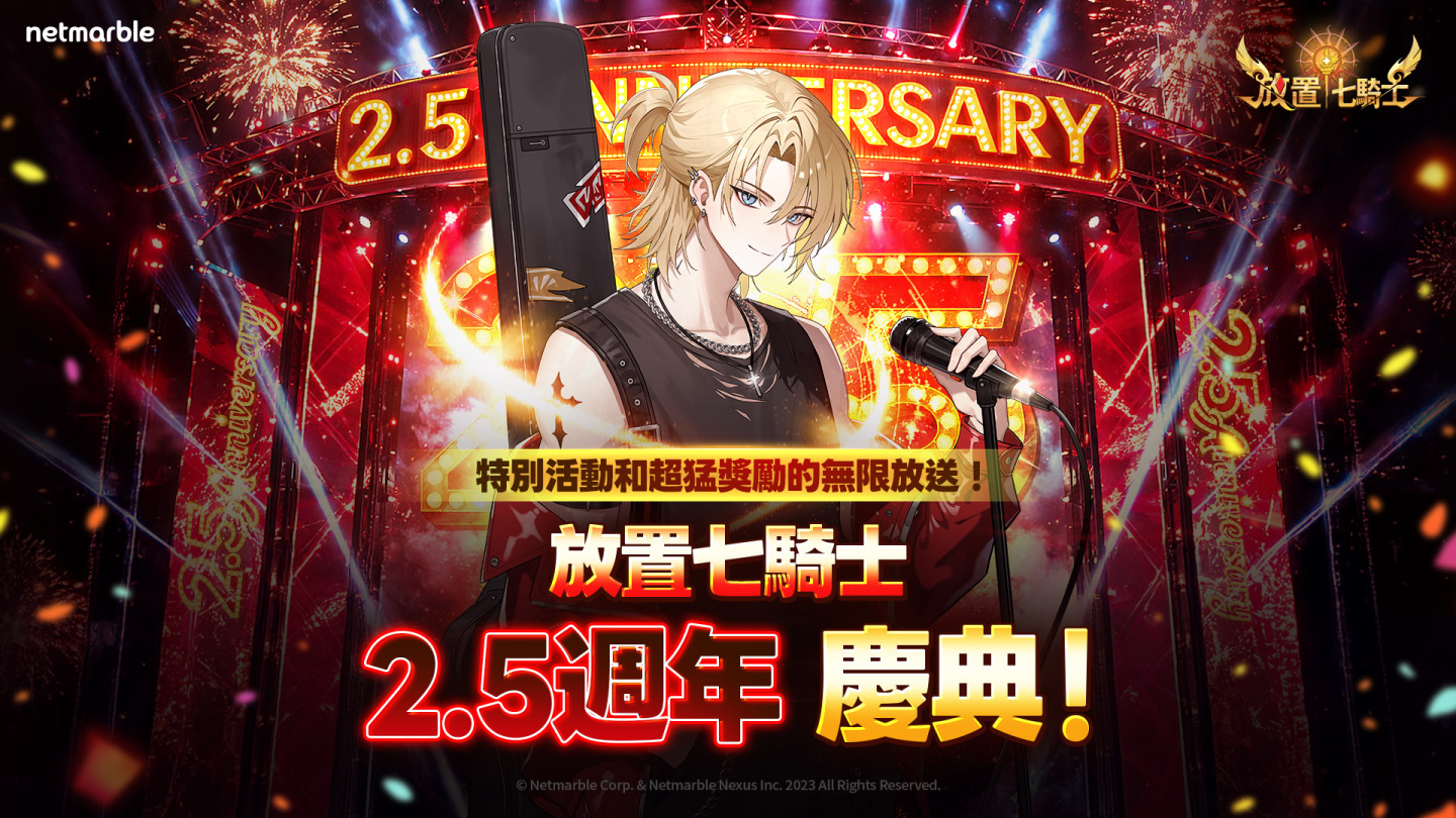 網石集團宣布,旗下《放置七騎士》推出大規模更新以慶祝遊戲上市2.5週年,並推出了一名全新英雄和各種限時遊戲內活動。作為本次更新的一部分,全新傳說英雄「舞台上戴倫斯」正式加入角色陣容。為紀念 2.5週年推出的「舞台上戴倫斯」,是代表性角色戴倫斯的樂團主題特別版本。當他完成覺醒後,將可進化為傳說+階級形態「主唱戴倫斯」。