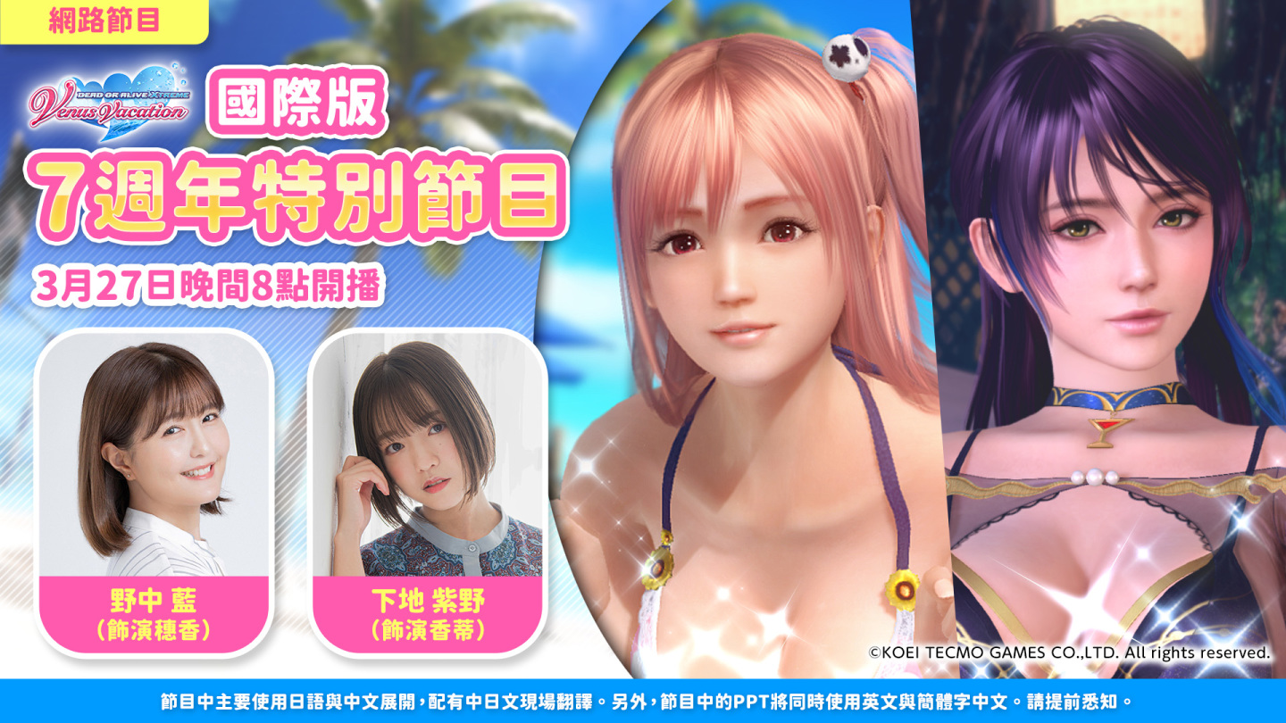 臺灣光榮特庫摩宣布,《DEAD OR ALIVE Xtreme Venus Vacation》(Steam/Johren),為紀念國際版營運7週年,預定於2026年3月27日晚間於YouTube/Steam商品頁面/Facebook/Weibo/bilibili直播「DEAD OR ALIVE Xtreme Venus Vacation 國際版7週年特別節目」。當天將邀請飾演「穗香」的聲優野中藍,以及飾演「香蒂」的聲優下地紫野。和豪華的來賓一起歡慶7週年吧!