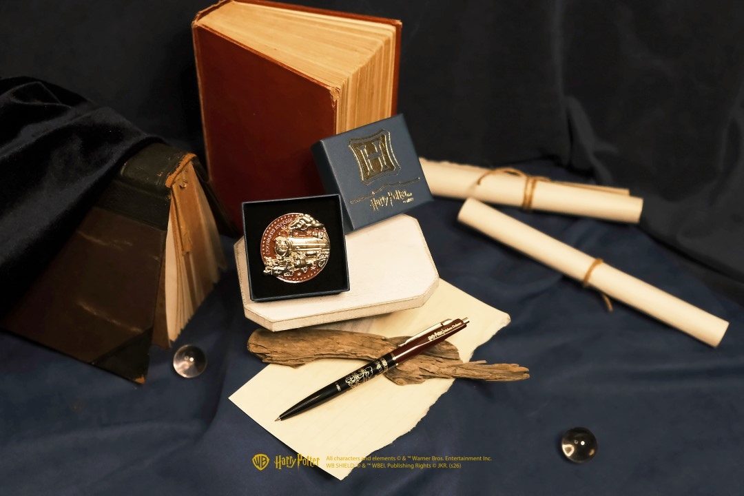 粉絲引頸期盼的台灣限定商品,也於門市一週年慶期間正式亮相。整體視覺設計呼應店內打卡場景,以「霍格華茲特快車」為主題,象徵專屬於台灣粉絲的魔法旅程。「限定金屬徽章」為Harry Potter - Mahou Dokoro常設店才有的原創商品,每間分店皆有各自的主題設計,僅於該店販售,徽章採立體浮雕工藝,做工精巧,4.2公分的大尺寸,搭配別緻的專屬收藏盒,是許多粉絲造訪日本店時的必買限定藏品。如今台灣1號店也推出專屬款式,適合當作珍藏紀念或伴手禮,別於包包或服飾上,也可為造型增添的魔法細節。「限定原子筆」同為霍格華茲特快車圖案,選用經典的紅黑金配色,以日本製的高品質,書寫流暢、手感細膩,是日常書寫的理想選擇,兼具收藏與實用性與紀念意義。